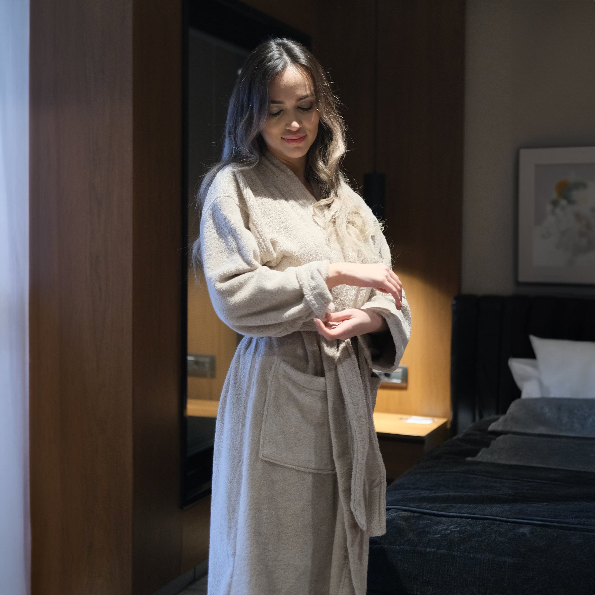 Das elegante beige Design in Unisex-Passform passt perfekt in jedes moderne Badezimmer. Ob für Sie oder Ihn – dieser Bademantel vereint Stil und Funktionalität.