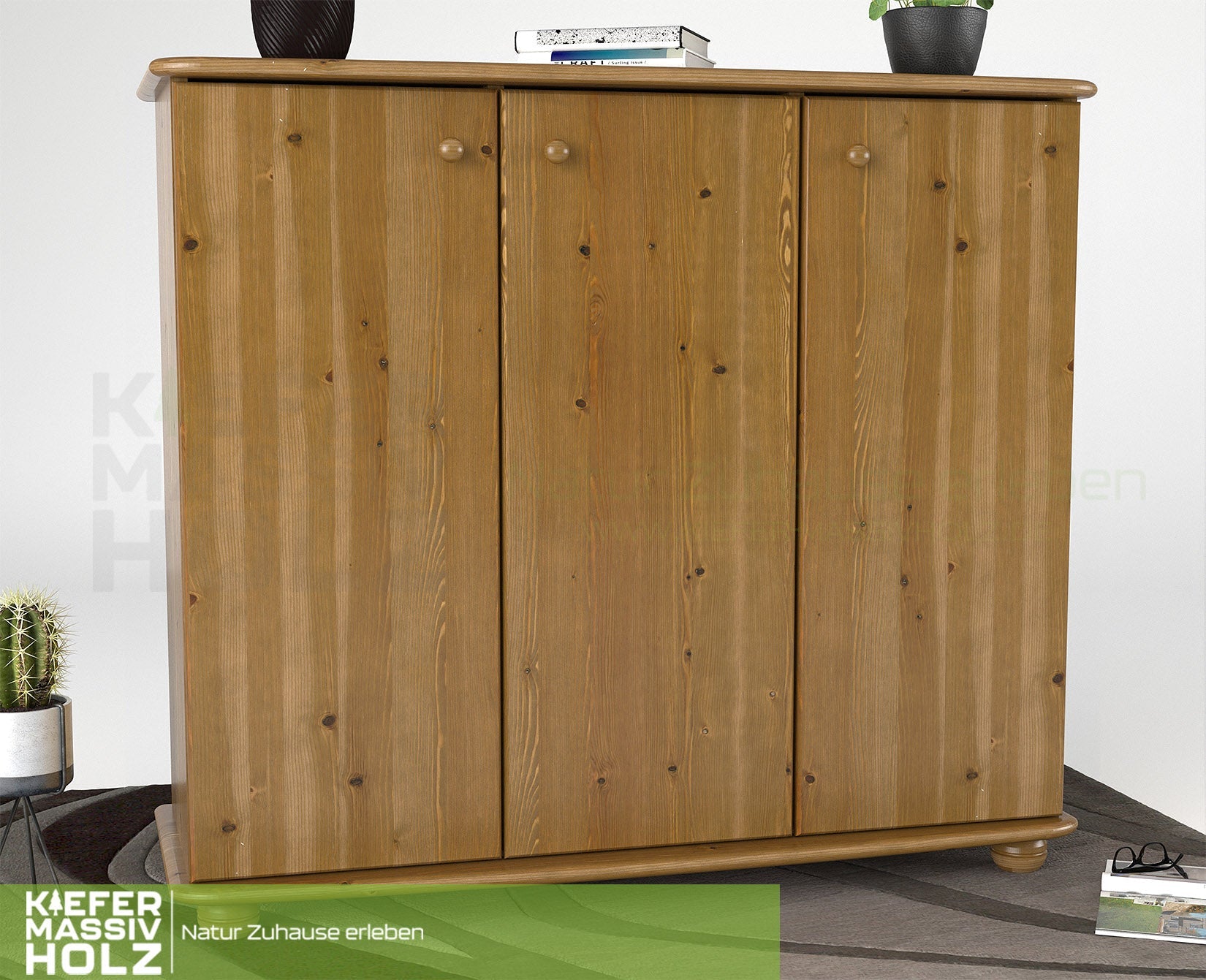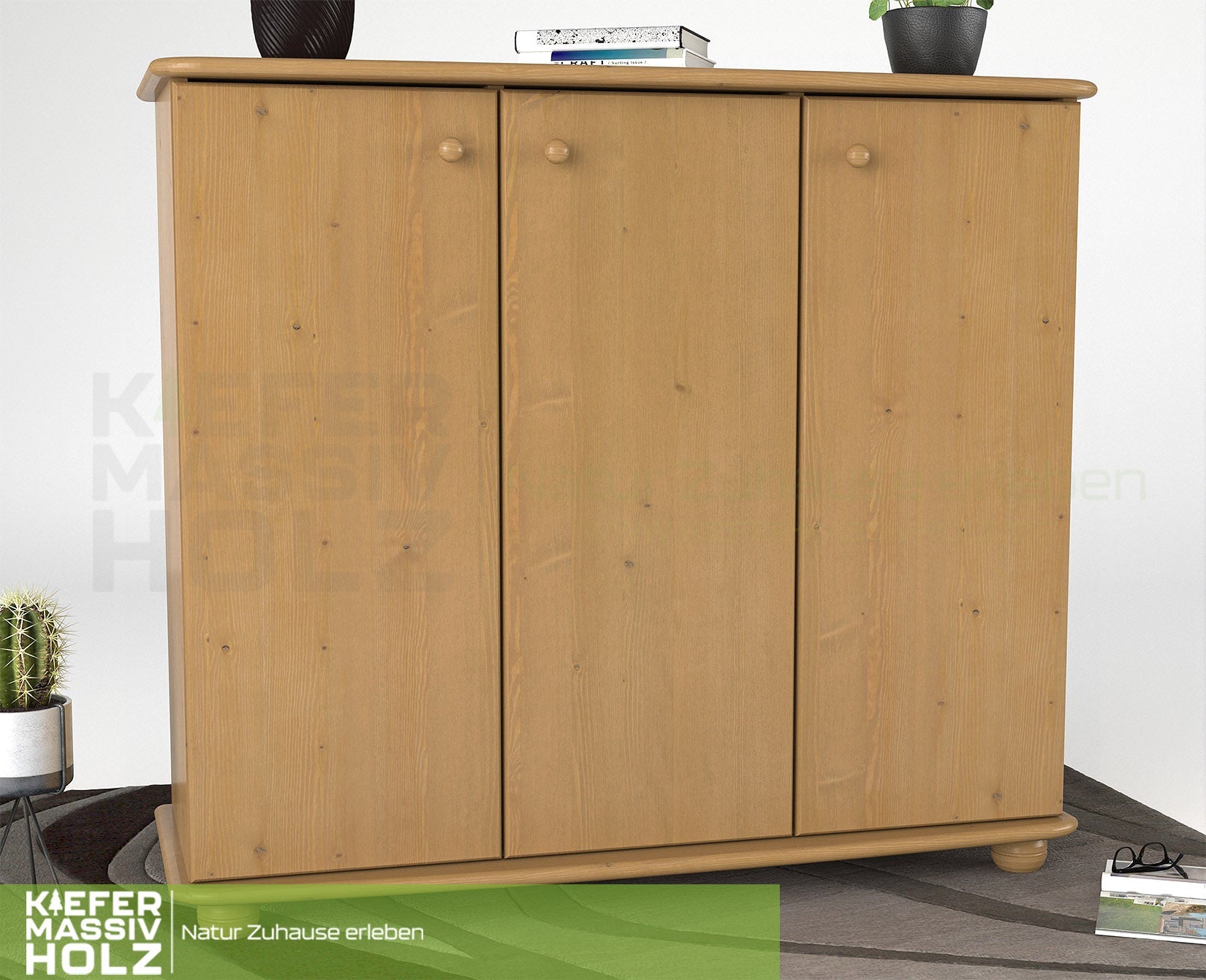 Keywords: Kiefer Massivholzkommode, 3-türige Kommode, verschlossene Regalfächer, nachhaltige Kommode, Massivholzmöbel, Stauraummöbel, Holzkommode