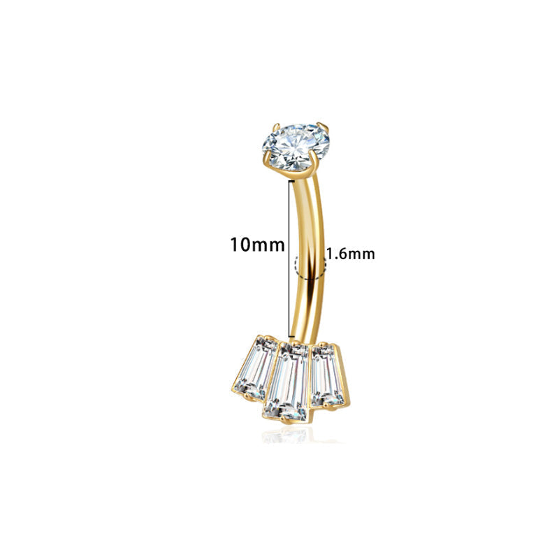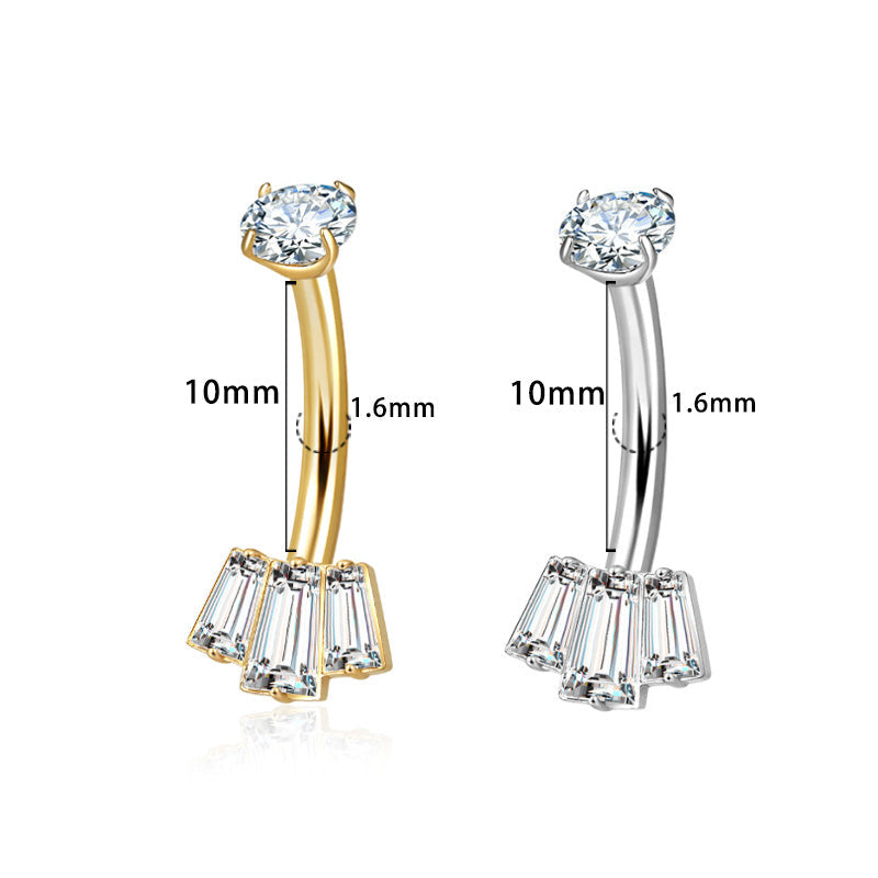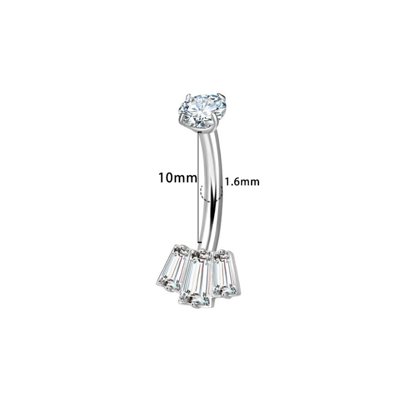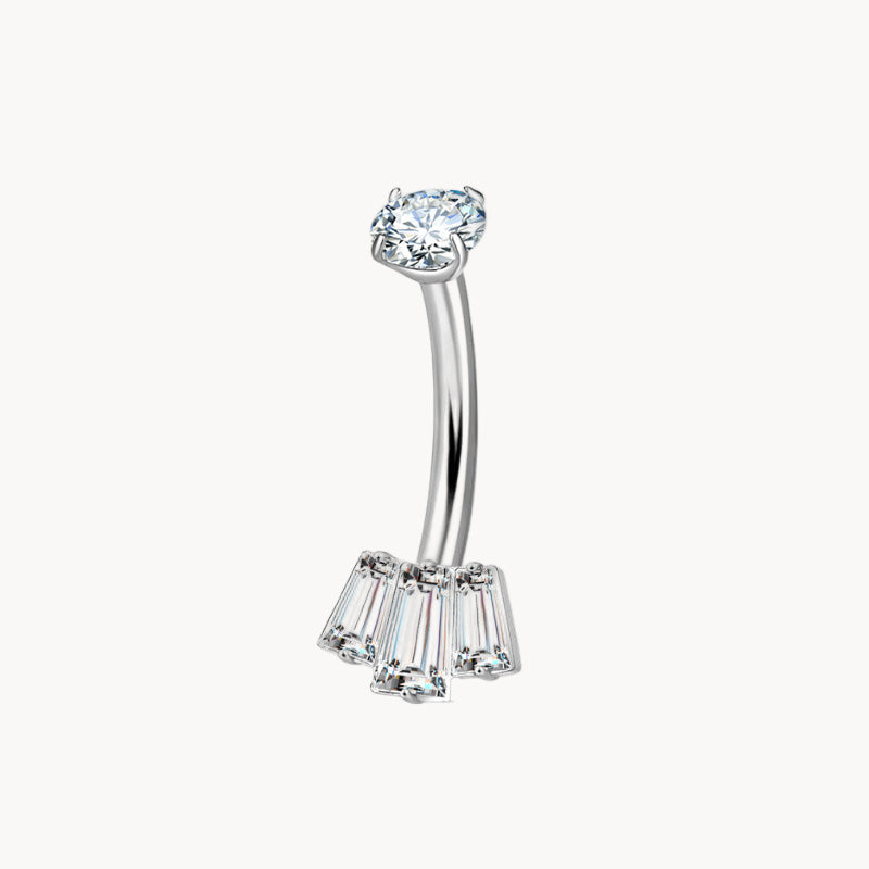 Zirkonia, sicher gefasst – oben rund, unten 3 Baguette-Steine im Fächer. Innengewinde für sanftes Einsetzen, wasserfest und kratzfest.