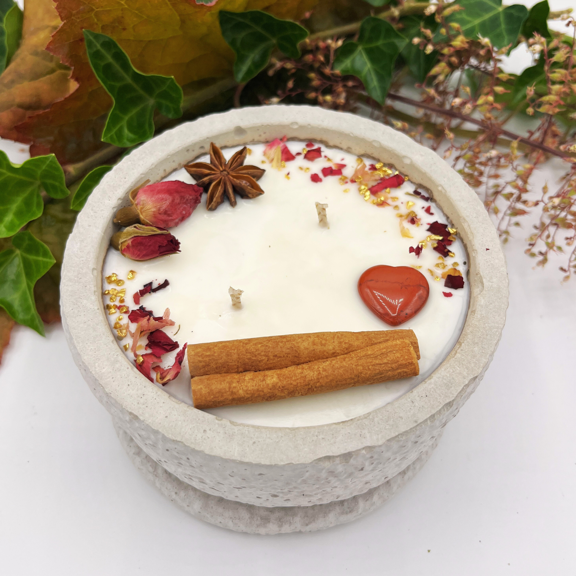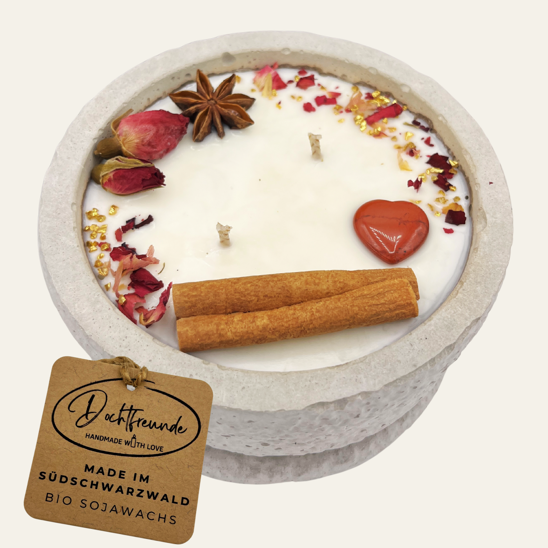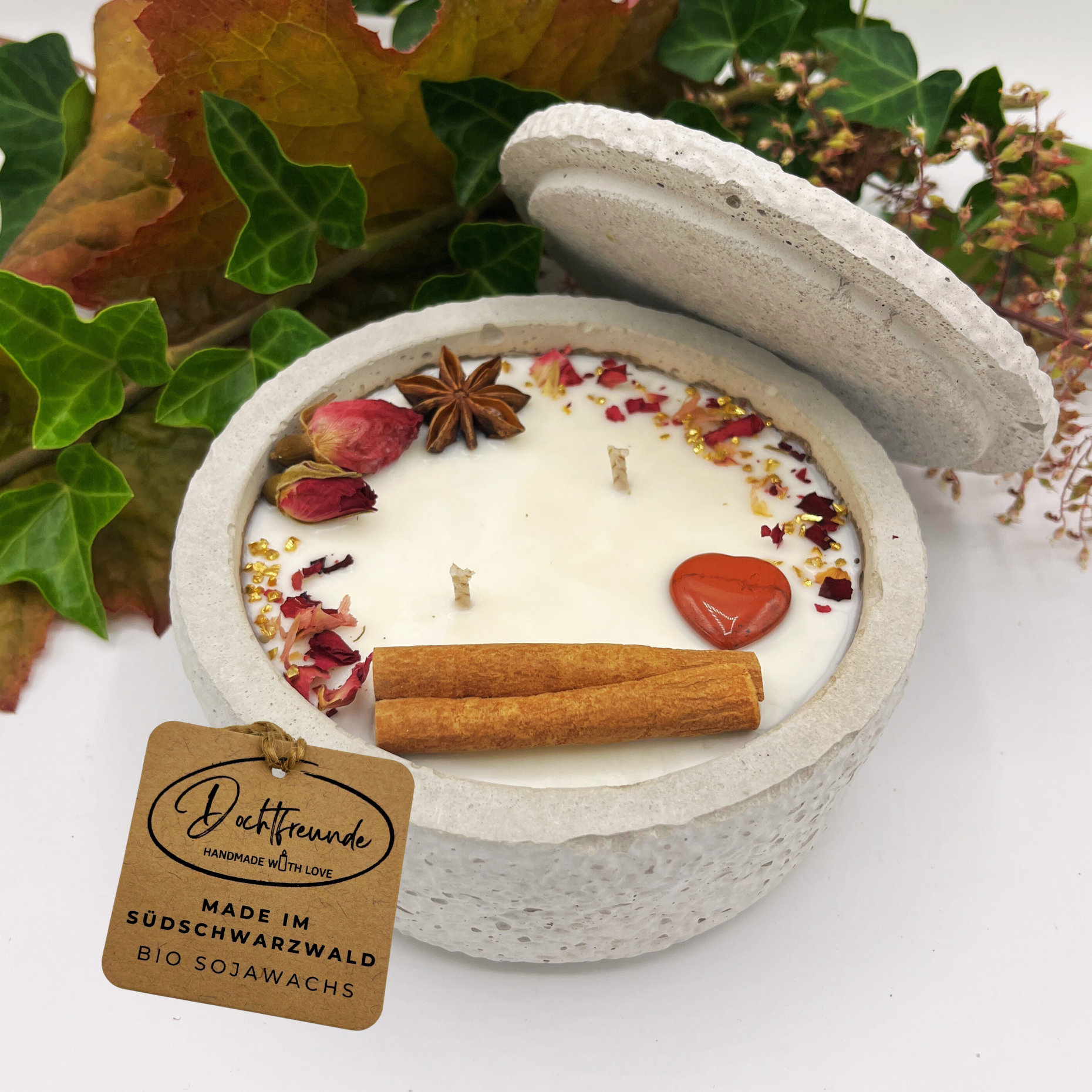 Schützen Sie die Kerze vor direkten Wettereinflüssen, um ihre Qualität zu erhalten, insbesondere bei Outdoor-Nutzung. Produktdetails Material: Veganes Sojawachs, versiegelter Beton, Baumwolldocht, getrocknete Blüten Gewicht: Ca. >0,75 kg inkl. Deckel / Endgewicht mit Wachs >1,00 kg