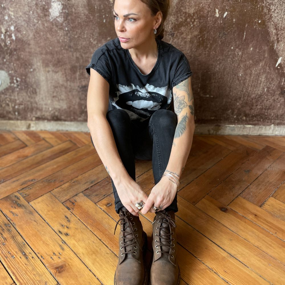 "Bite my Lips" - Vintage T-Shirt von Pulver & Blei. Lässig weit geschnitten mit gerollten Ärmeln und etwas weiterem Halsausschnitt. T-Shirt aus stückgefärbter Baumwolle. Schöne Vintage-Waschung. Der Vintage-Effekt kann sich durch waschen oder starke Sonneneinstrahlung weiter verstärken.