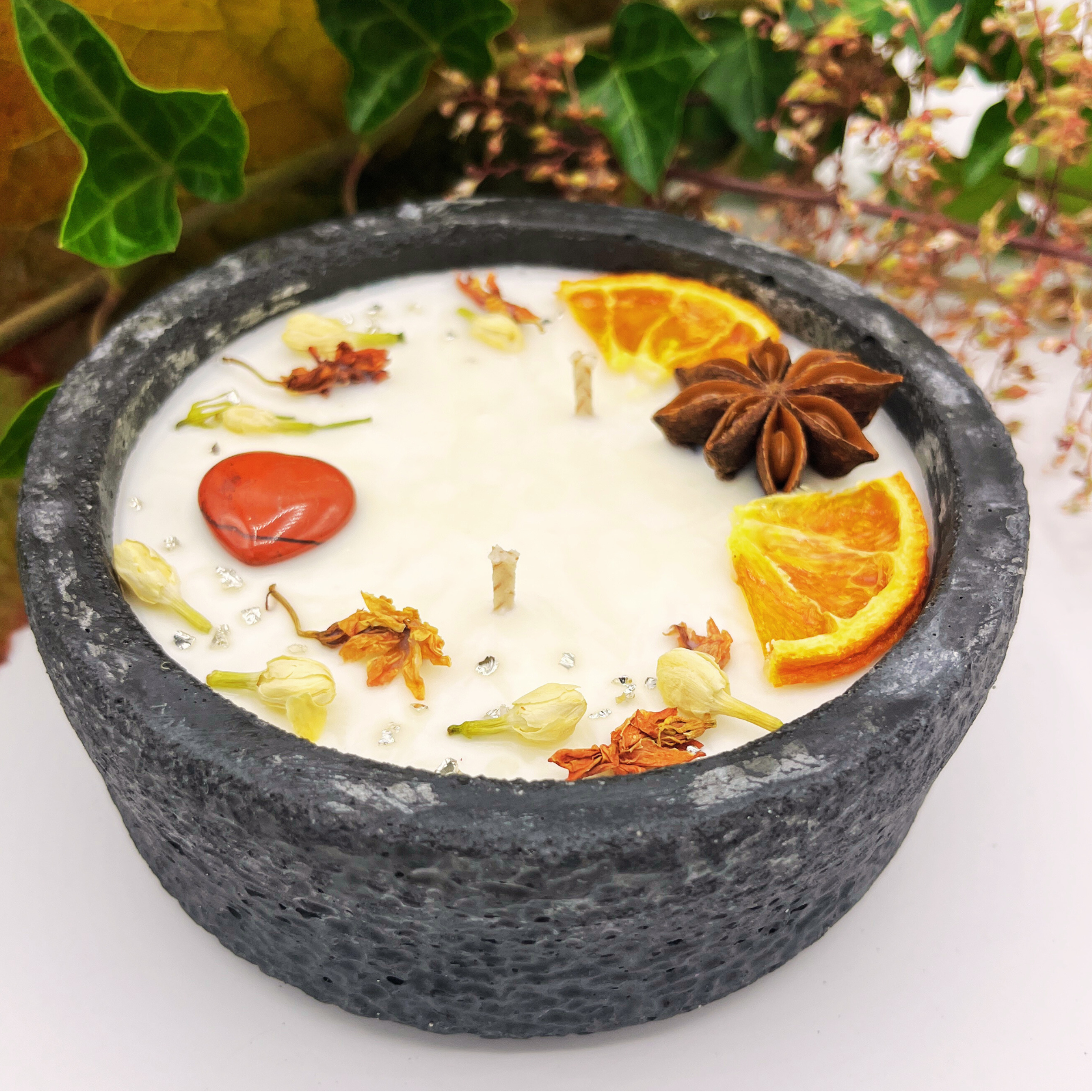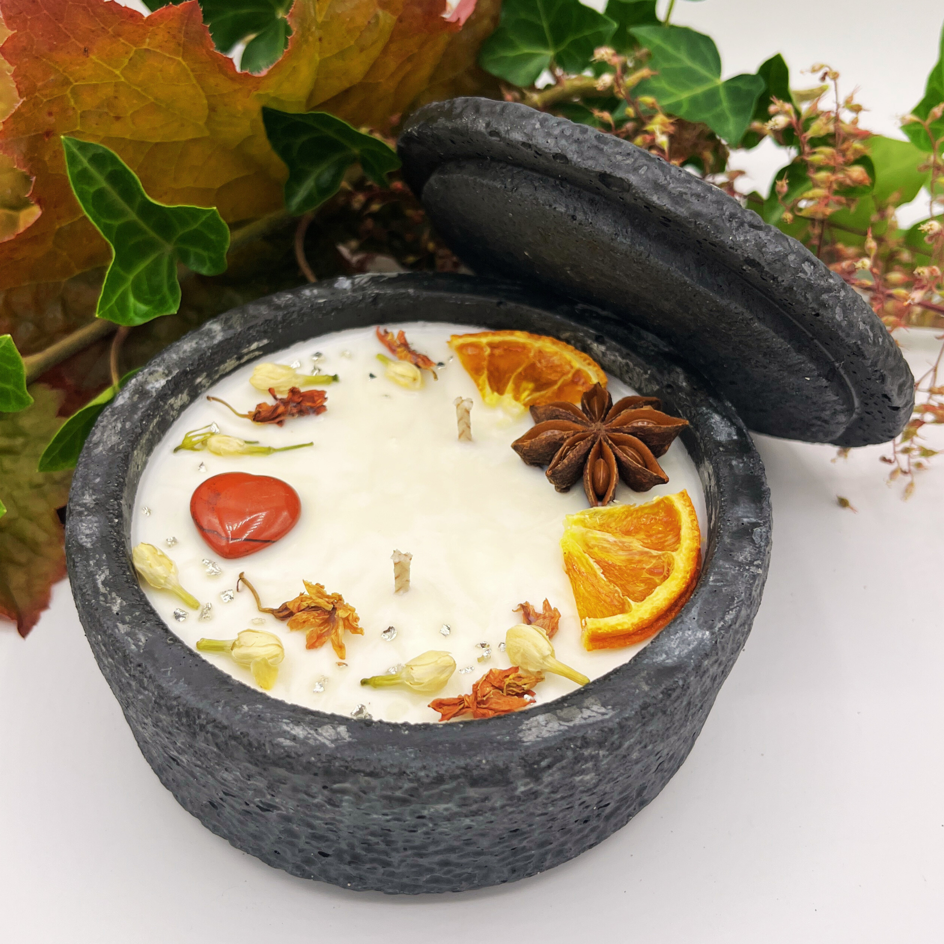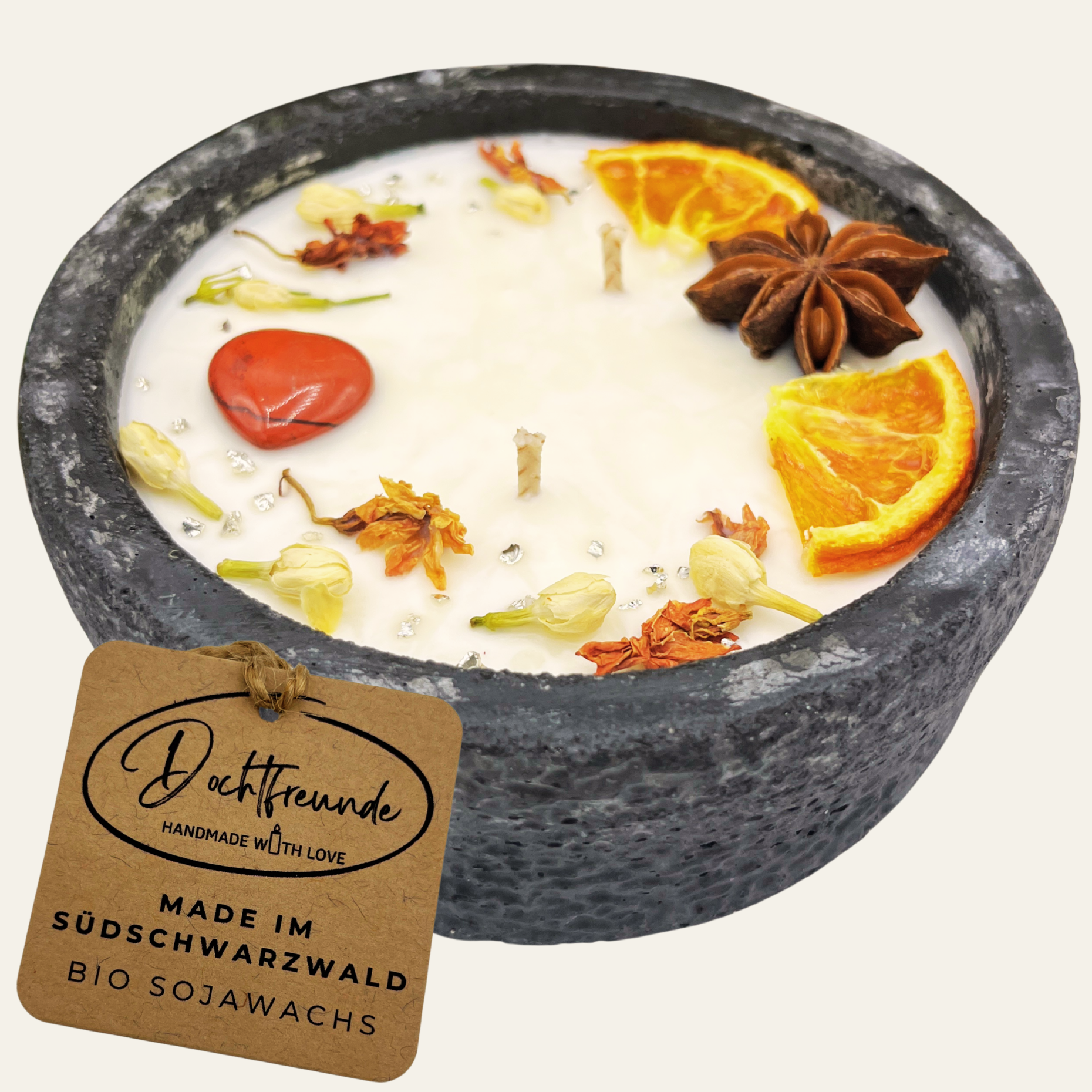 Schützen Sie die Kerze vor direkten Wettereinflüssen, um ihre Qualität zu erhalten, insbesondere bei Outdoor-Nutzung. Produktdetails Material: Veganes Sojawachs, versiegelter Beton, Baumwolldocht, getrocknete Blüten Gewicht: Ca. >0,75 kg inkl. Deckel / Endgewicht mit Wachs >1,00 kg