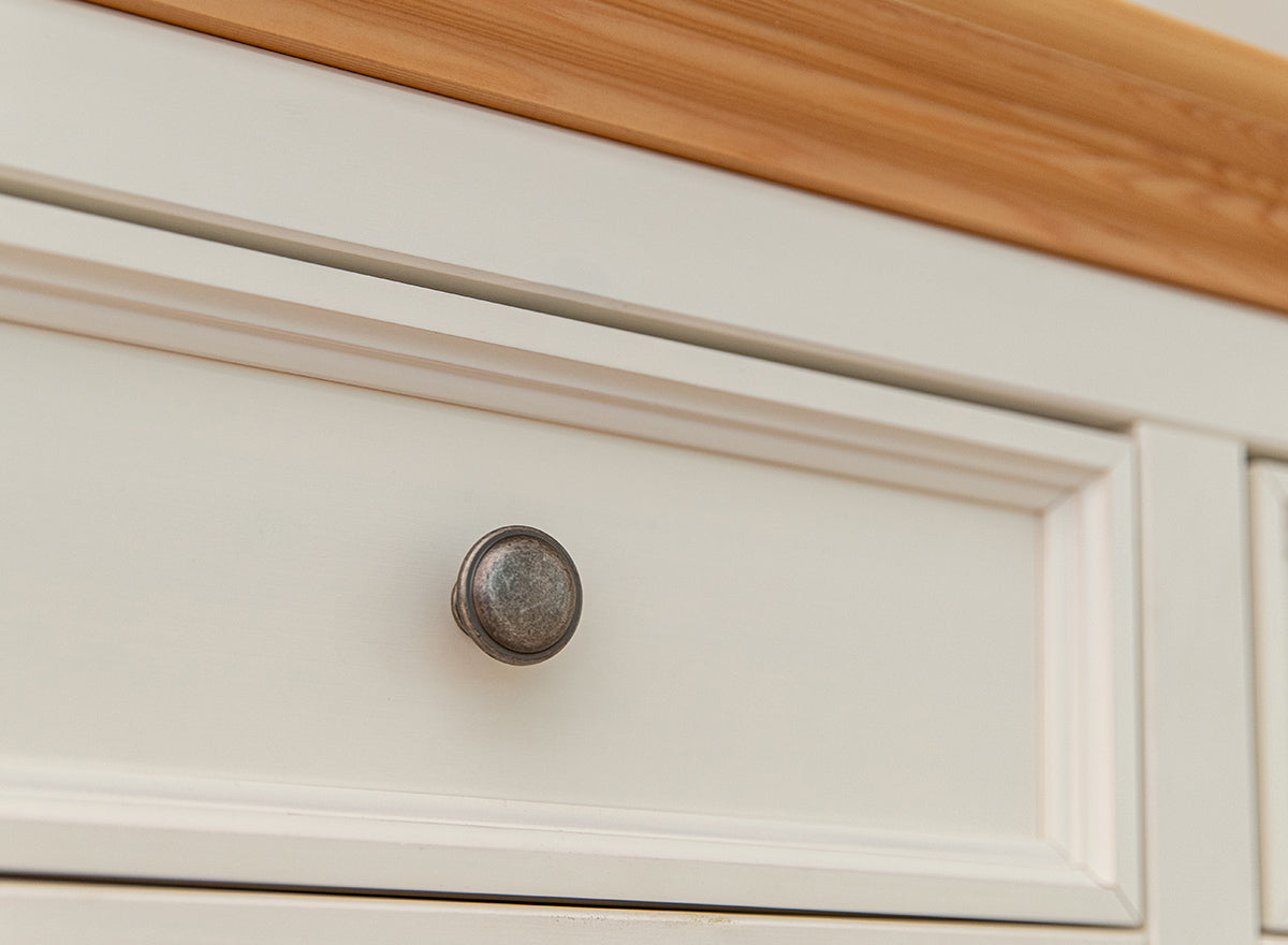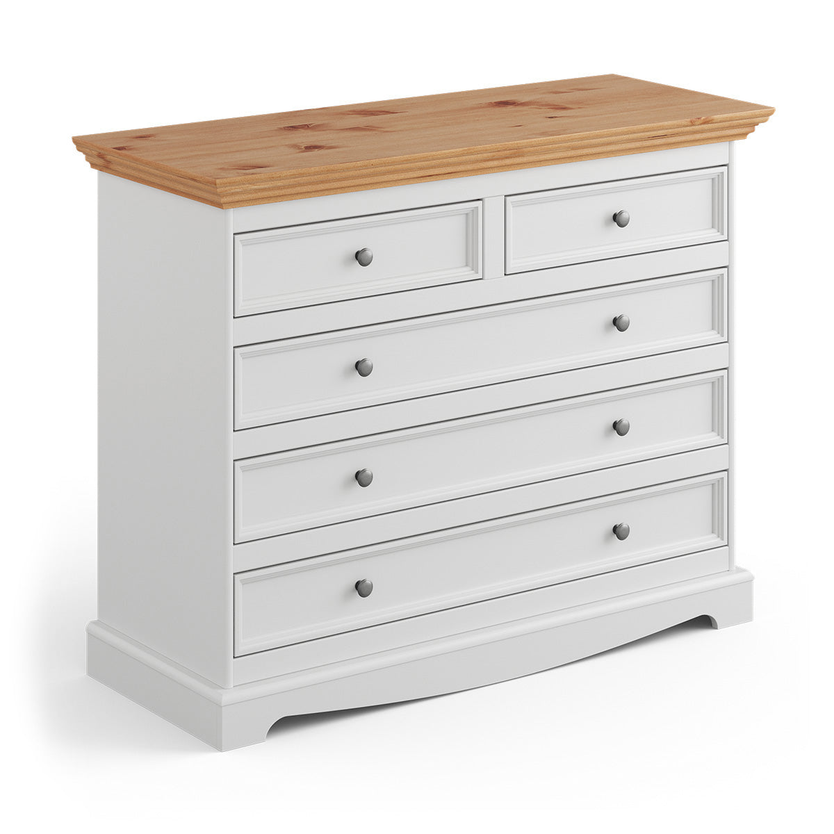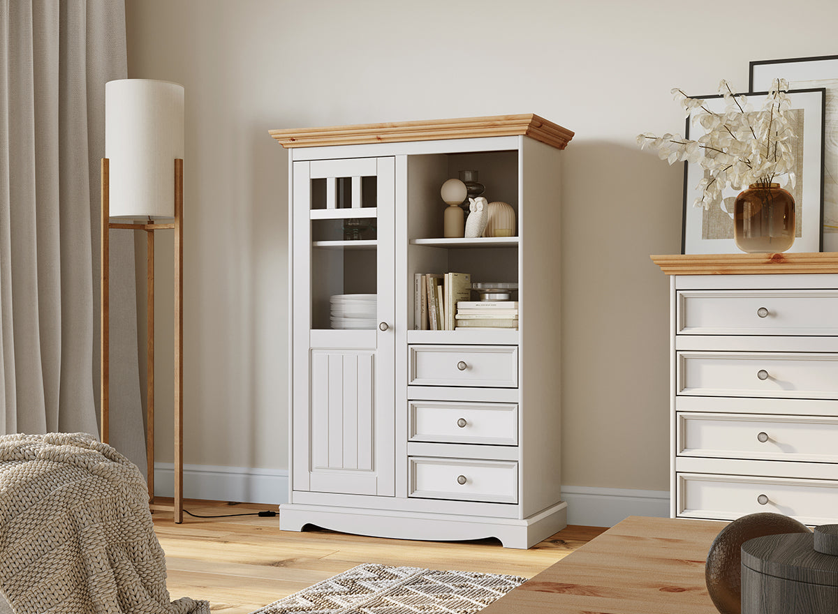 Die Bologna Elegante Kommode in Weiß mit naturbelassener Kiefernholzplatte kombiniert zeitlose Eleganz mit praktischer Funktionalität. Dank ihrer durchdachten Aufteilung in fünf geräumige Schubladen sorgt sie für mühelose Ordnung in jedem Wohnbereich – ob Schlafzimmer, Wohnzimmer, Flur oder Esszimmer. Die feinen dekorativen Fräsungen, stilvollen Antiksilber-Knopfgriffe und der elegante Rahmen an den Fronten unterstreichen den provenzalischen Stil und machen dieses Möbelstück zu einem echten Hingucker.