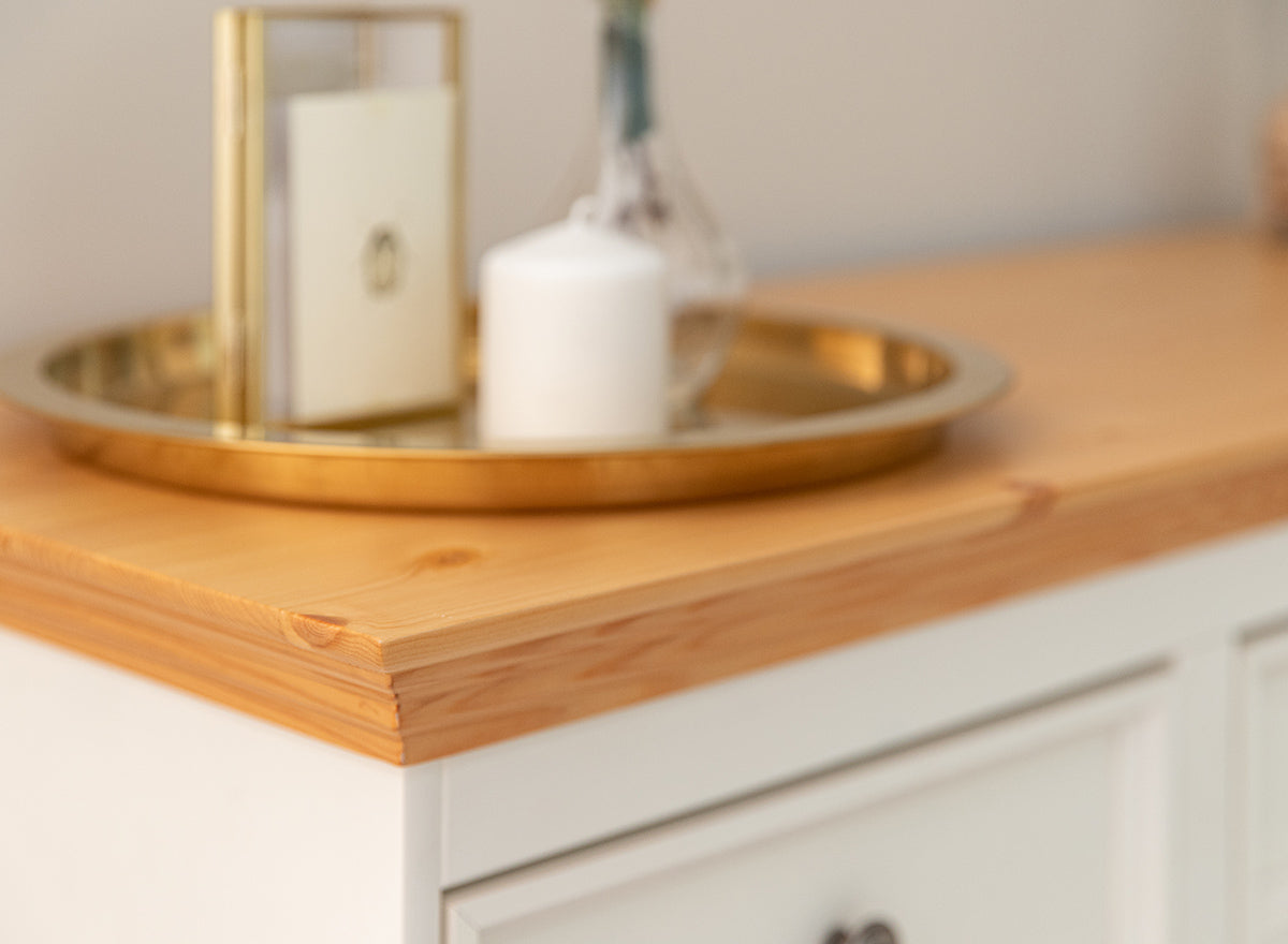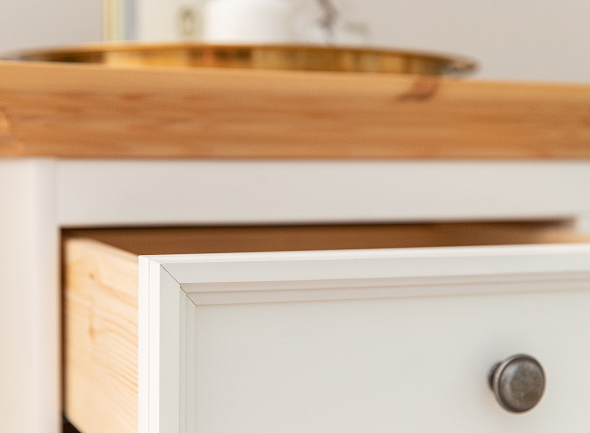 Hergestellt aus ökologischem, finnischem Kiefernholz, überzeugt diese Kommode durch ihre Stabilität und Langlebigkeit. Die weiß lackierte Oberfläche (85 % Deckkraft) lässt die natürliche Holzmaserung sanft durchscheinen, während die Kiefernholzplatte mit einer wasserbasierten Lackierung und Beize veredelt wurde. So bleibt die authentische Holzstruktur mit ihren einzigartigen Ringen und Ästen erhalten.