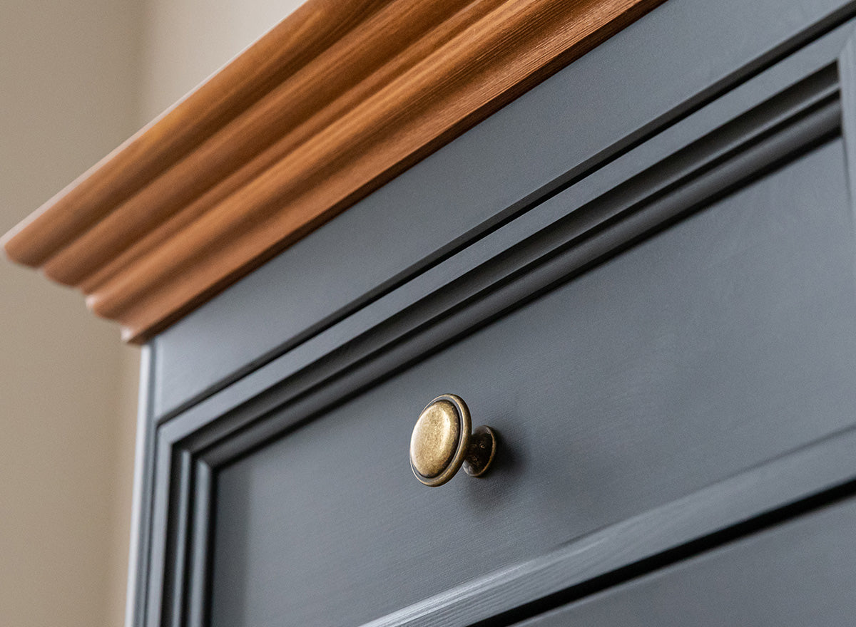 Die Kombination aus dunklem Graphit & warmer Eiche liegt voll im Trend und bringt moderne Eleganz mit natürlichem Charme in Ihr Zuhause. Die verzierten Fräsungen, vertikalen Rillen & antiken Knopfgriffe verleihen der Kommode den authentischen Provence-Stil.