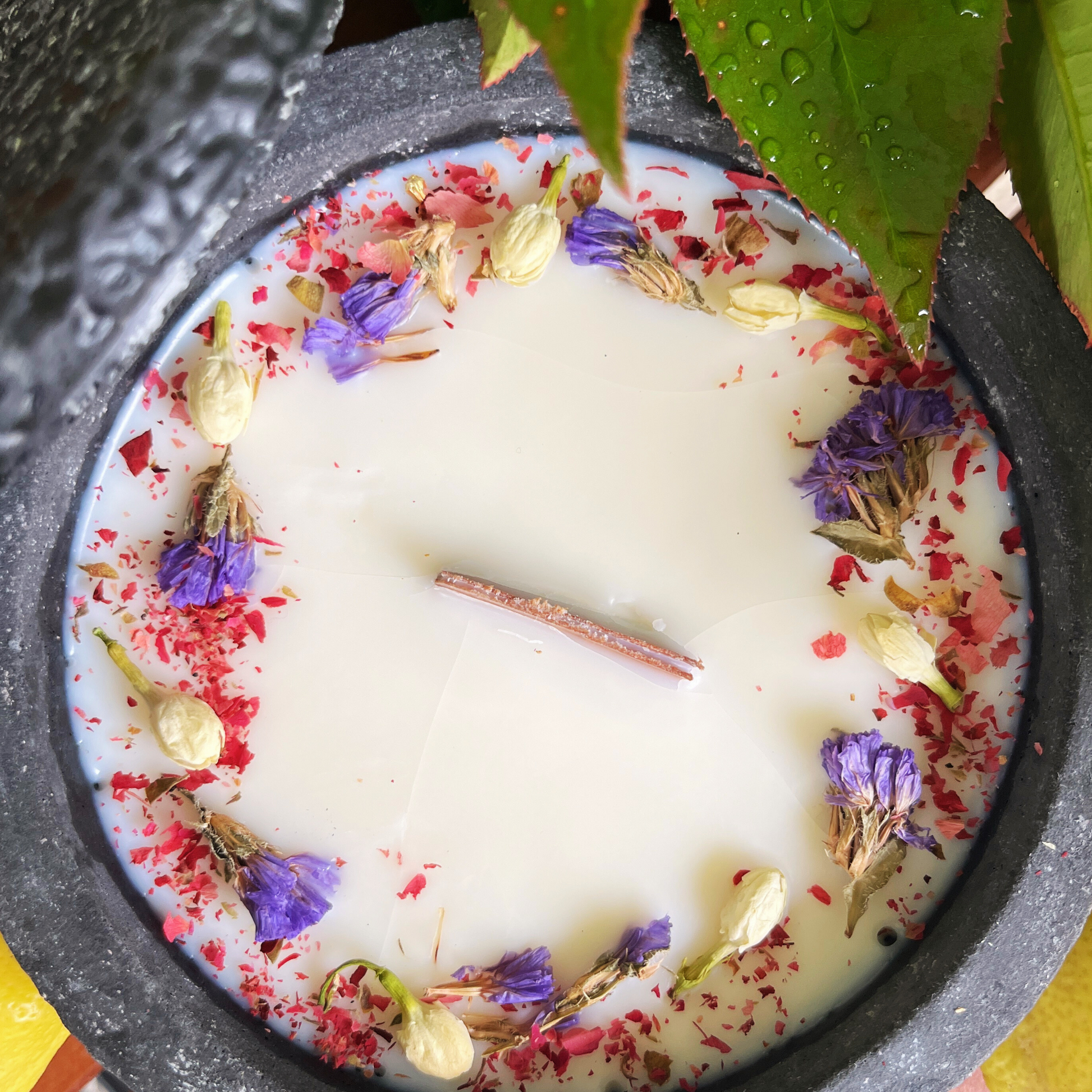 · Material: Veganes Sojawachs, versiegelter Beton, Holzdocht, getrocknete Blüten