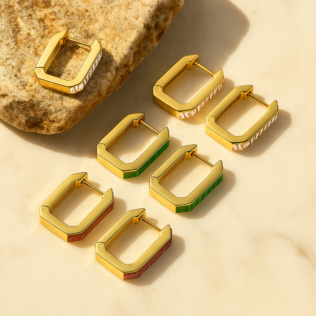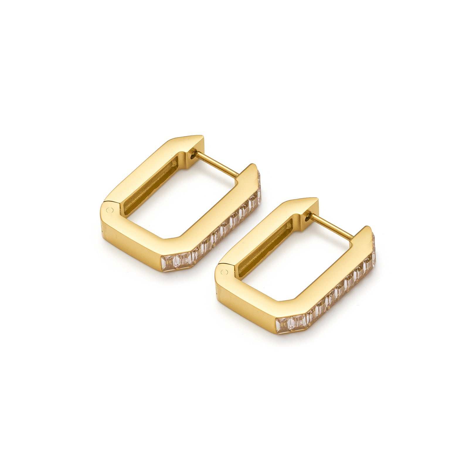 Design & Tragegefühl: Eckige Creole mit seitlich gefassten Zirkonia. Ca. 3 mm Breite, ca. 20 mm Höhe. Sicherer und komfortabler Click-Mechanismus.