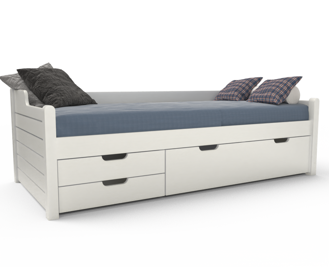 Das Design des Bettes mit 3 Schubladen bietet eine Lösung für schnelles Auspacken im Kinderzimmer. Kissen und Decken können in einer tiefen Schublade aufbewahren werden und kleinere Gegenstände können in kleineren Schubladen platziert werden.