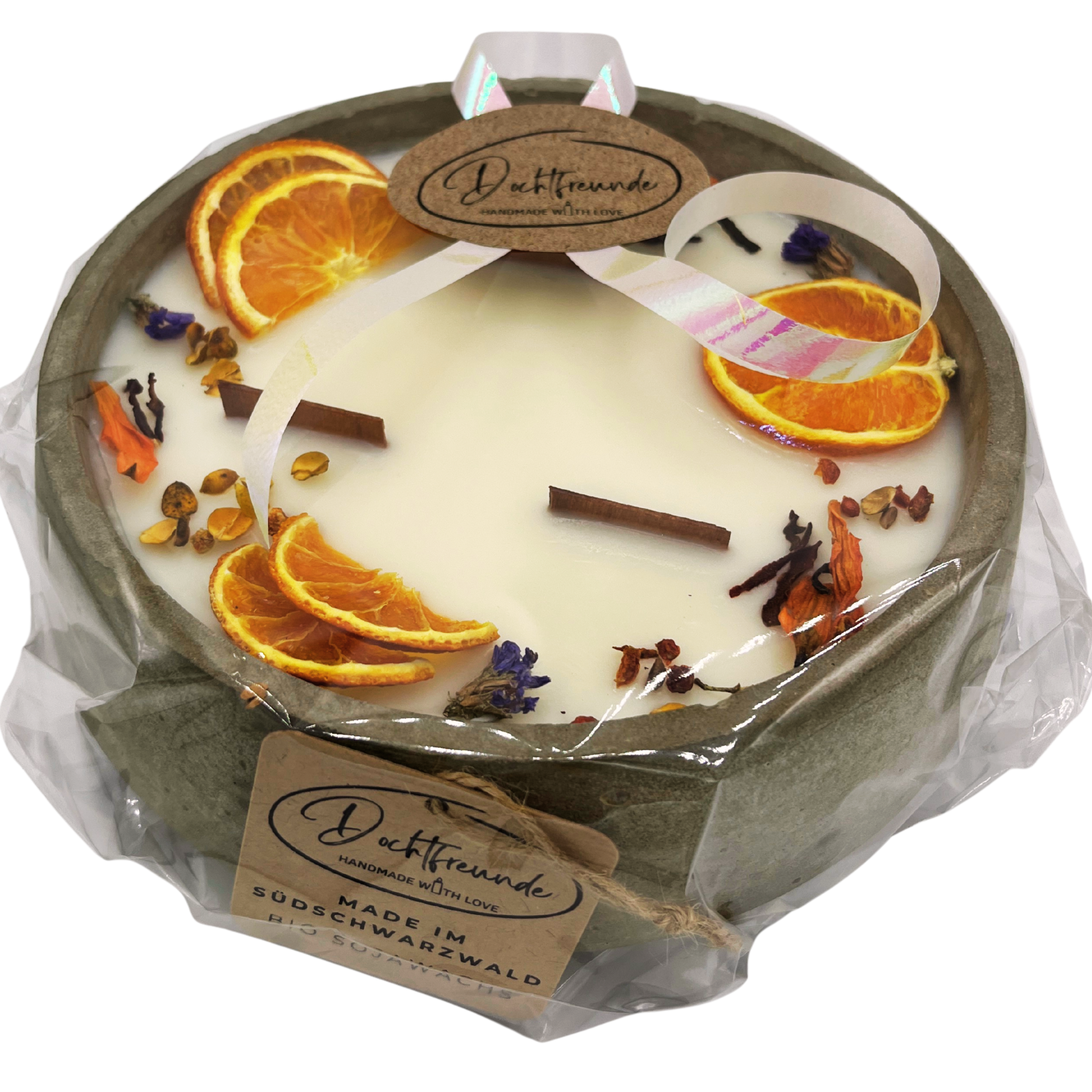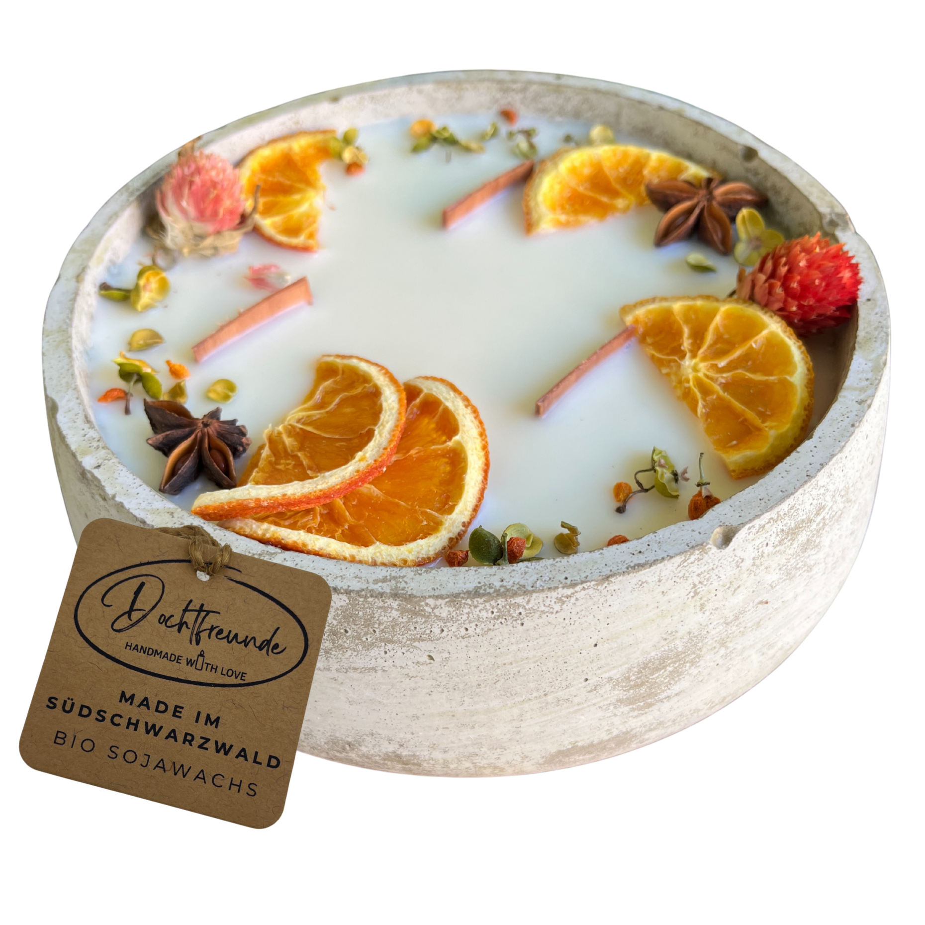 - Material: Veganes Sojawachs, versiegelter Beton, Holzdocht, getrocknete Blüten.