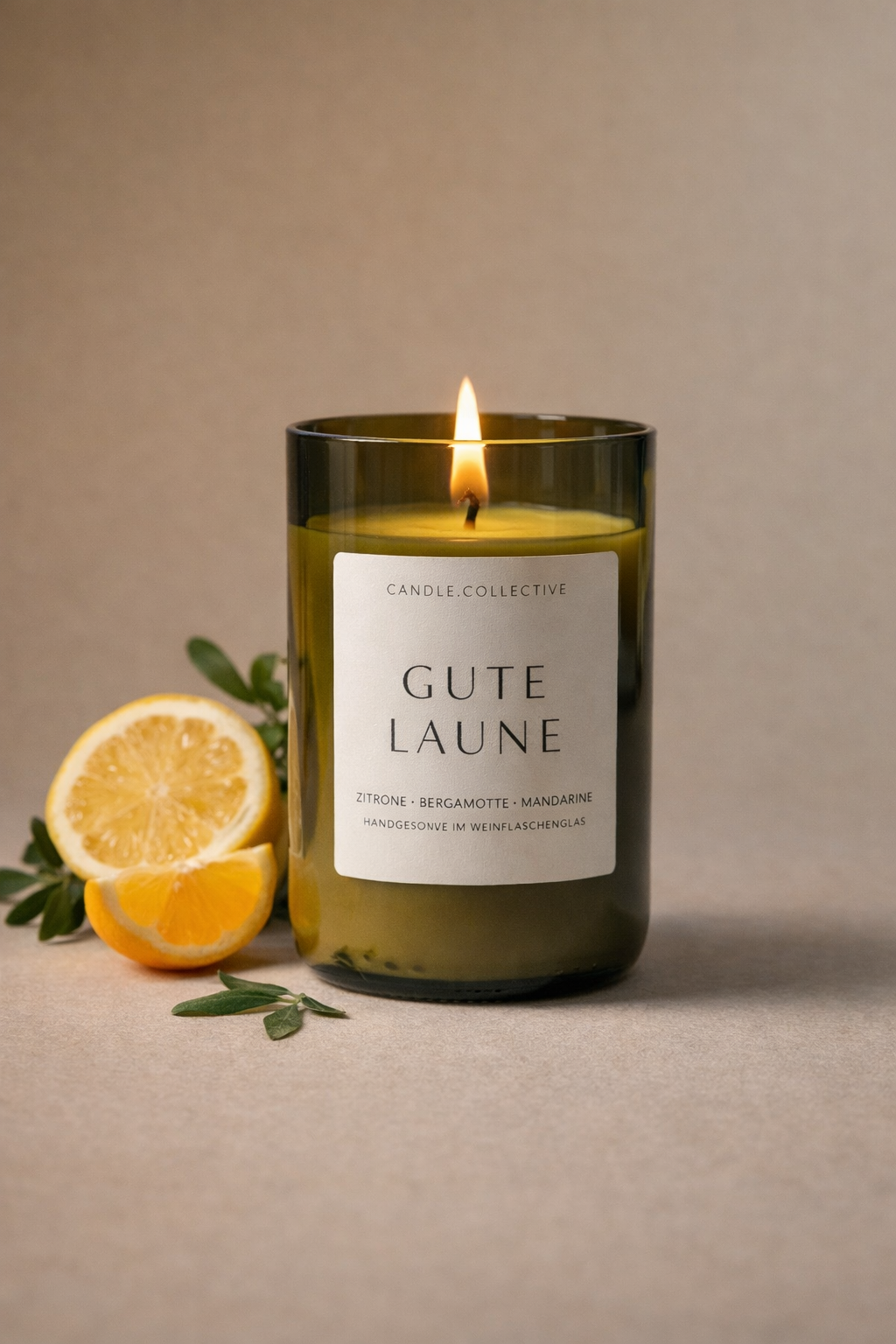 Stellen Sie sich vor, wie der frische Zitrusduft Ihr Wohnzimmer erfüllt – ein Hauch von Sommer und Leichtigkeit, der sofort die Stimmung hebt. Die warme Flamme flackert sanft in der eleganten Weinflasche, während das natürliche Sojawachs gleichmäßig und rußfrei abbrennt. Jede Kerze ist ein Unikat mit eigener Geschichte.