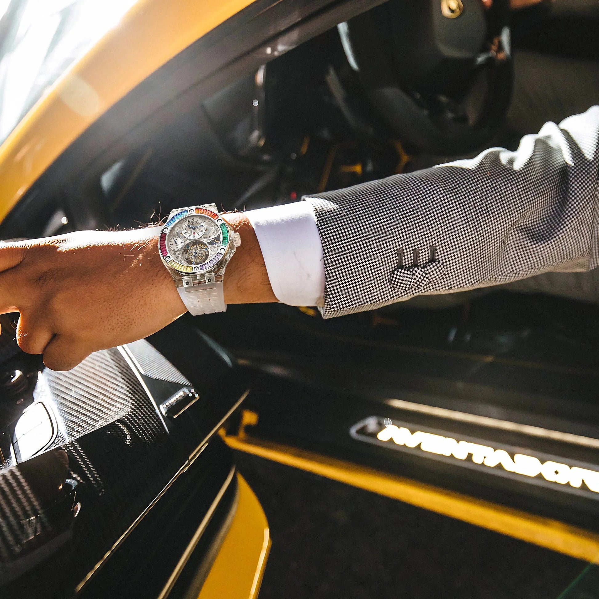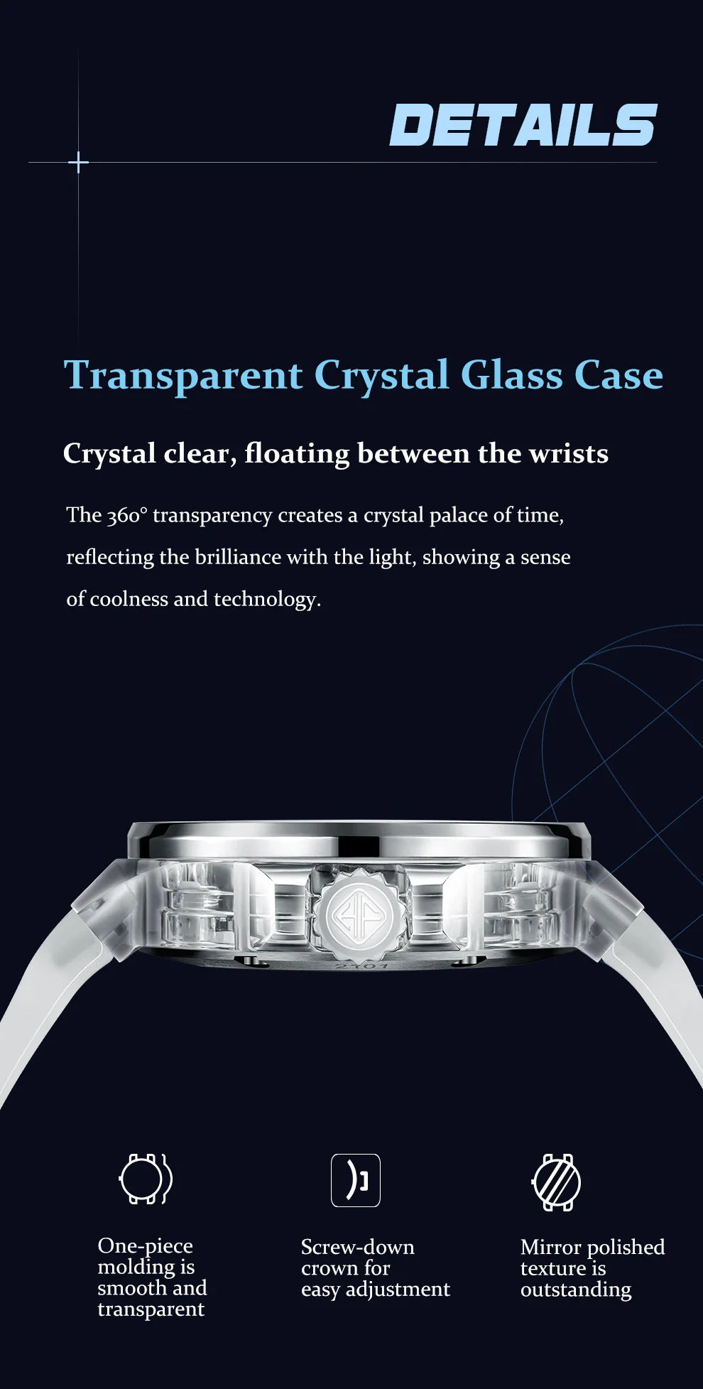 The mirror-polished sapphire crystal not only enhances durability but keeps the display crystal-clear under all lighting conditions, while the transparent strap adds comfort and futuristic flair.