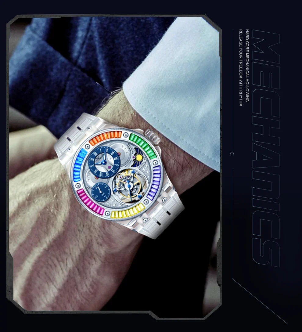 Step into a new era of horology with the Haofa 2101 Tourbillon, a limited-edition masterpiece featuring a fully transparent K9 crystal case, a rainbow bezel, and a bold skeleton design. This timepiece blends luxury, futuristic style, and mechanical precision to create a truly eye-catching wrist watch that’s as much an art piece as it is an instrument of time.
