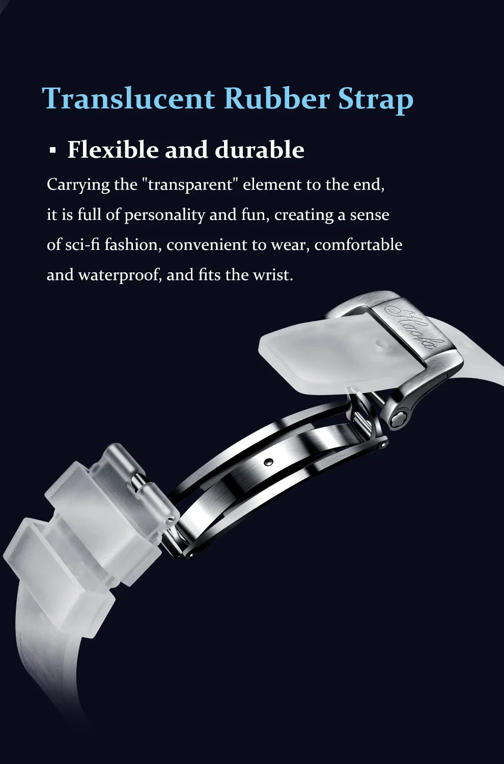 band: translucent rubber strap – breathable, waterproof, futuristic feel
