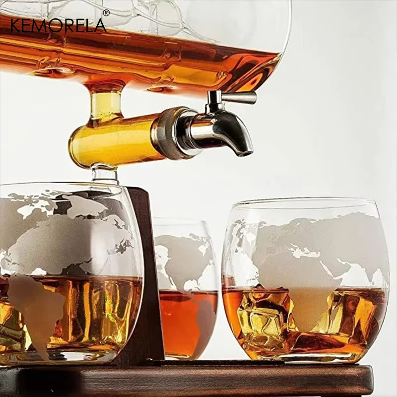 KEMORELA Antik Schiff Dekanter Set Whiskey Rotwein | 4 Gläser Halter