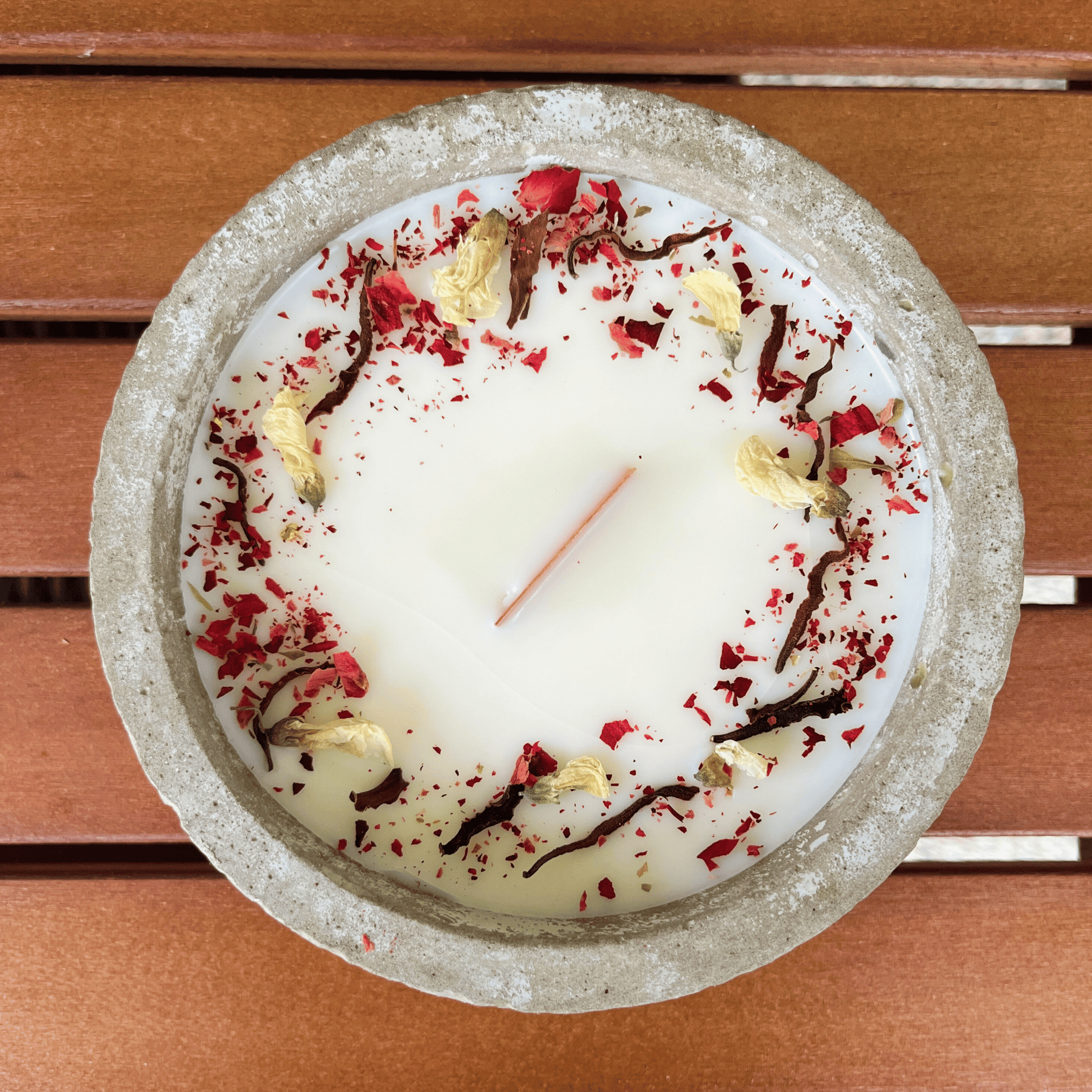 • Material: Veganes Sojawachs, versiegelter Beton, Holzdocht, getrocknete Blüten.