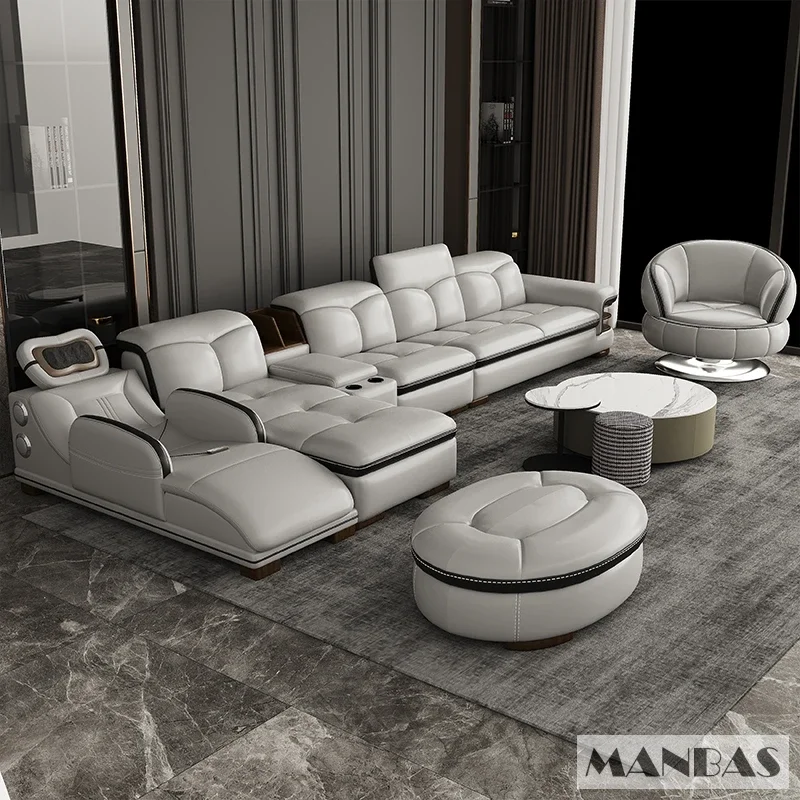 Eine moderne Genuine Leather Sectional Couch mit integriertem Bluetooth-Lautsprecher und Massagefunktion für das ultimative Wohnzimmererlebnis.