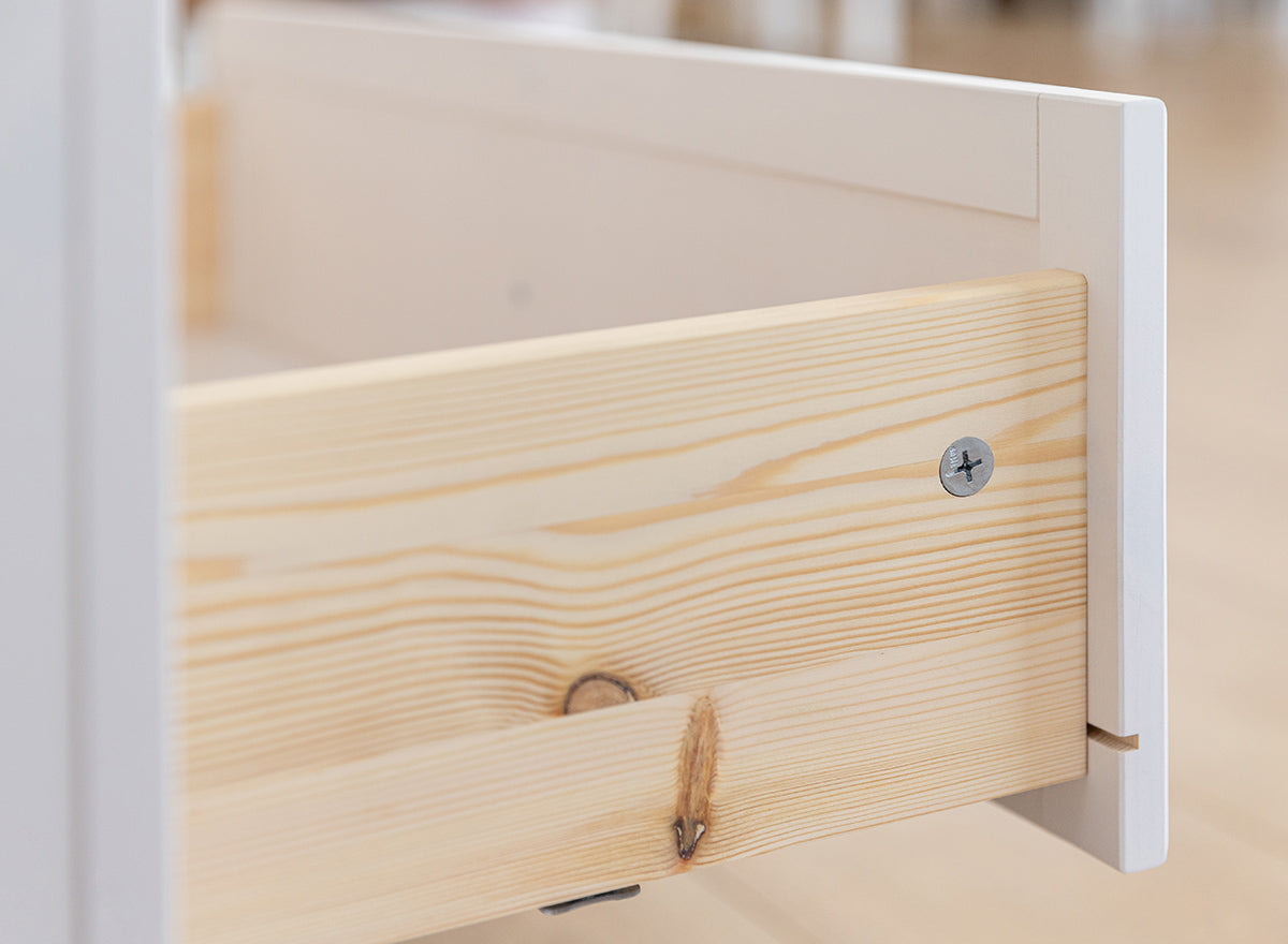 Die Wahl der Materialien und die Konstruktion sind für die Stabilität und Haltbarkeit der Möbel verantwortlich. Deshalb bemühen wir uns bereits in der Produktionsphase darum, Materialien von höchster Qualität auszuwählen. Die Kommode aus Kiefernholz besteht aus finnischer Kiefer, die sehr plastisch und frost- und hitzebeständig ist.