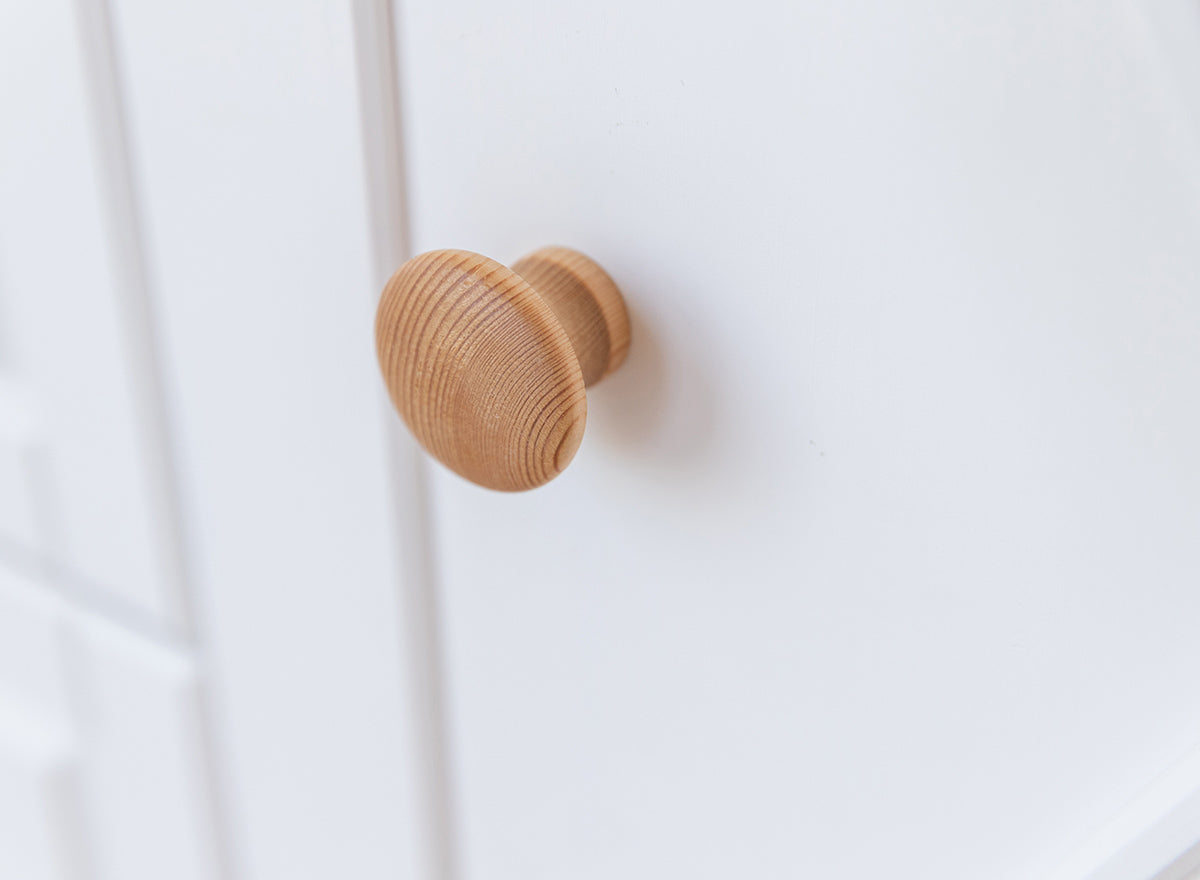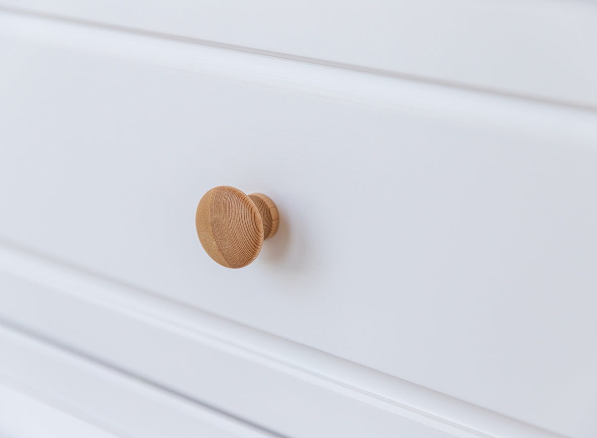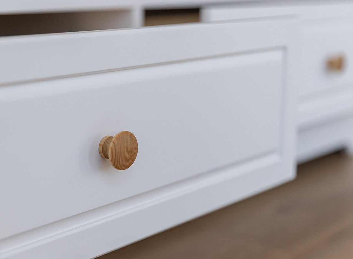 Die richtige Auswahl der Materialien ist eine Sache, die richtige Vorbereitung und Pflege eine andere. Beginnen wir mit der Fertigstellung der weißen Kommode. Die goldgelbe Oberseite wurde mit Wasserbeize und Wasserlack überzogen, was die natürliche Schönheit des Holzes und die Maserung und Äste hervorhebt. Der weiße Korpus und die Fronten wurden mit wasserbasiertem Lack mit einer Deckkraft von 85 % lackiert. Ergänzt wird das Ganze durch Holzgriffe und Rahmen an den Fronten.