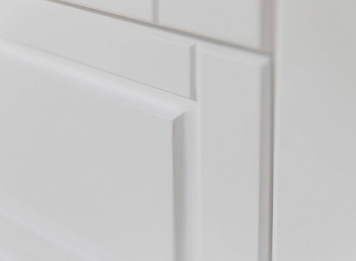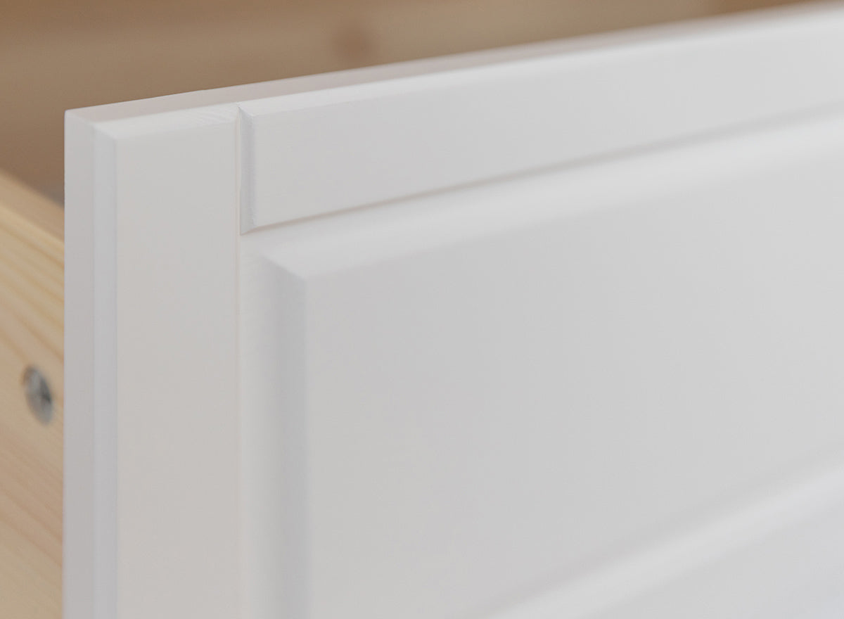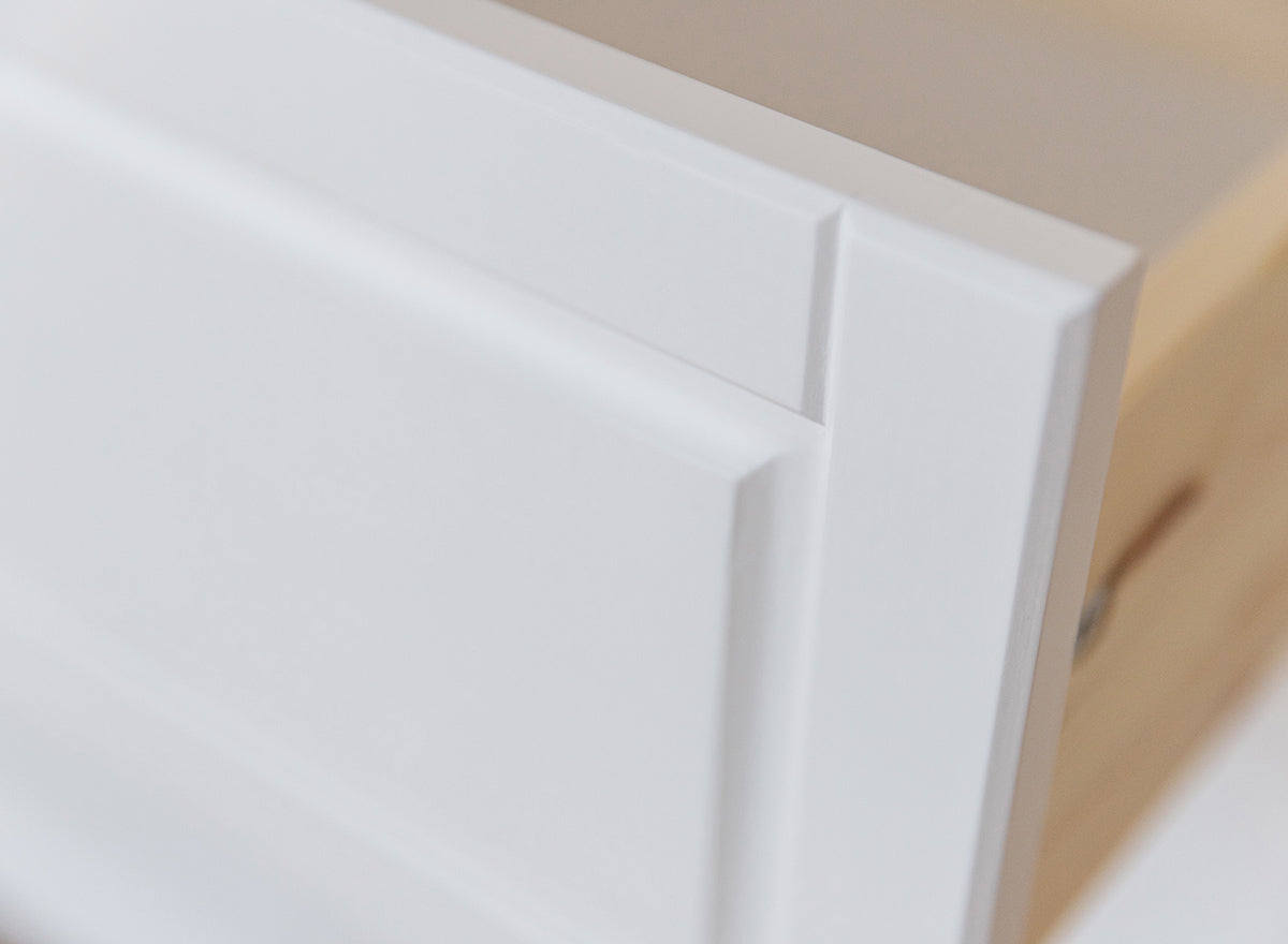 Die richtige Auswahl der Materialien ist eine Sache, die richtige Vorbereitung und Pflege eine andere. Beginnen wir mit der Fertigstellung der weißen Kommode. Die goldgelbe Oberseite wurde mit Wasserbeize und Wasserlack überzogen, was die natürliche Schönheit des Holzes und die Maserung und Äste hervorhebt. Der weiße Korpus und die Fronten wurden mit wasserbasiertem Lack mit einer Deckkraft von 85 % lackiert. Ergänzt wird das Ganze durch Holzgriffe und Rahmen an den Fronten.