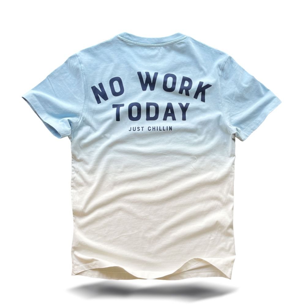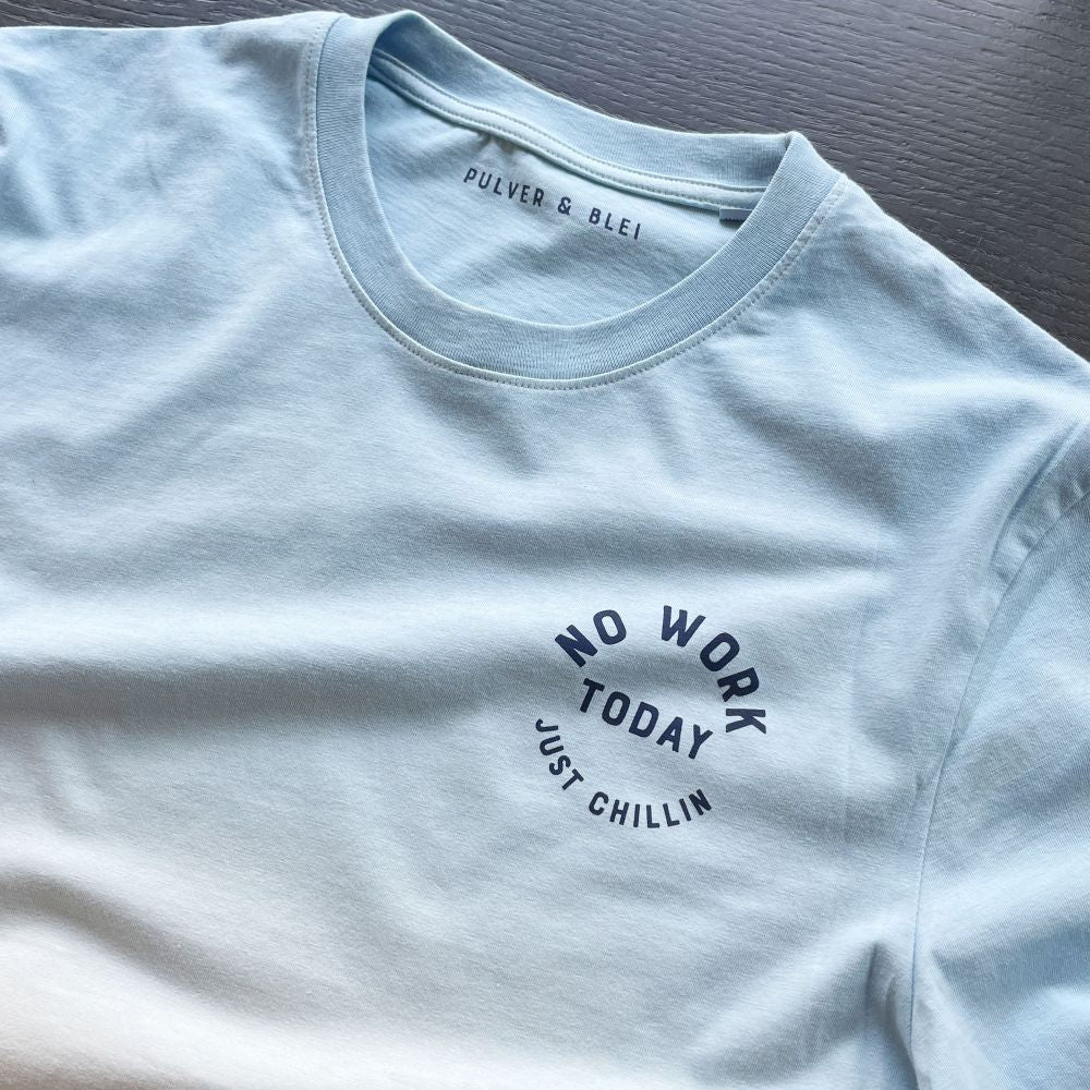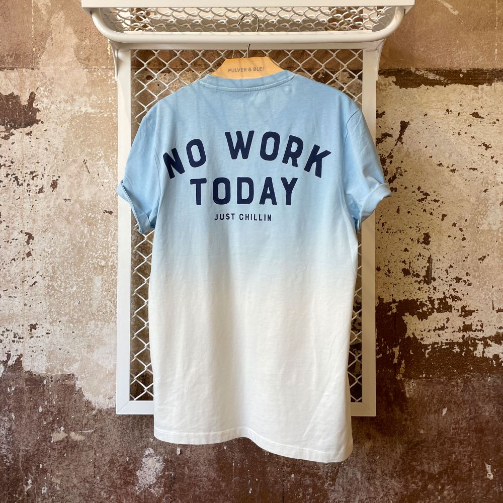 "No Work - just Chillin" unser Sommershirt im frischen Look mit tollem Tragekomfort. Gefertigt aus hochwertiger Biobaumwolle mit gefärbtem Blauverlauf. Großer Rückendruck und kleiner Brustdruck. T-Shirt im Unisex-Schnitt mit normaler Passform.