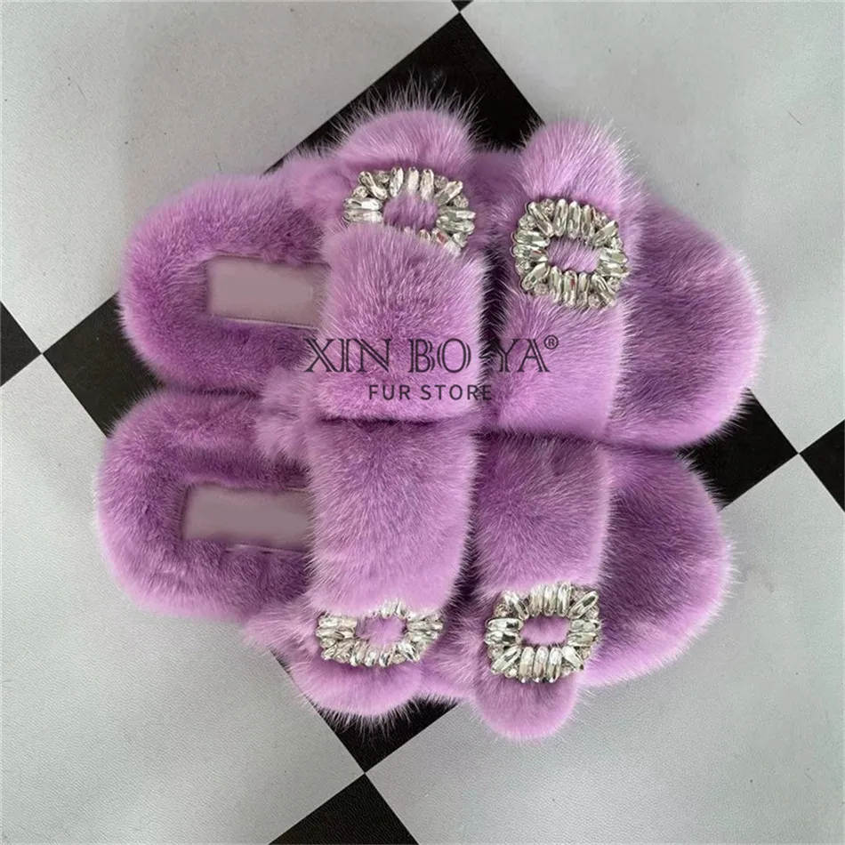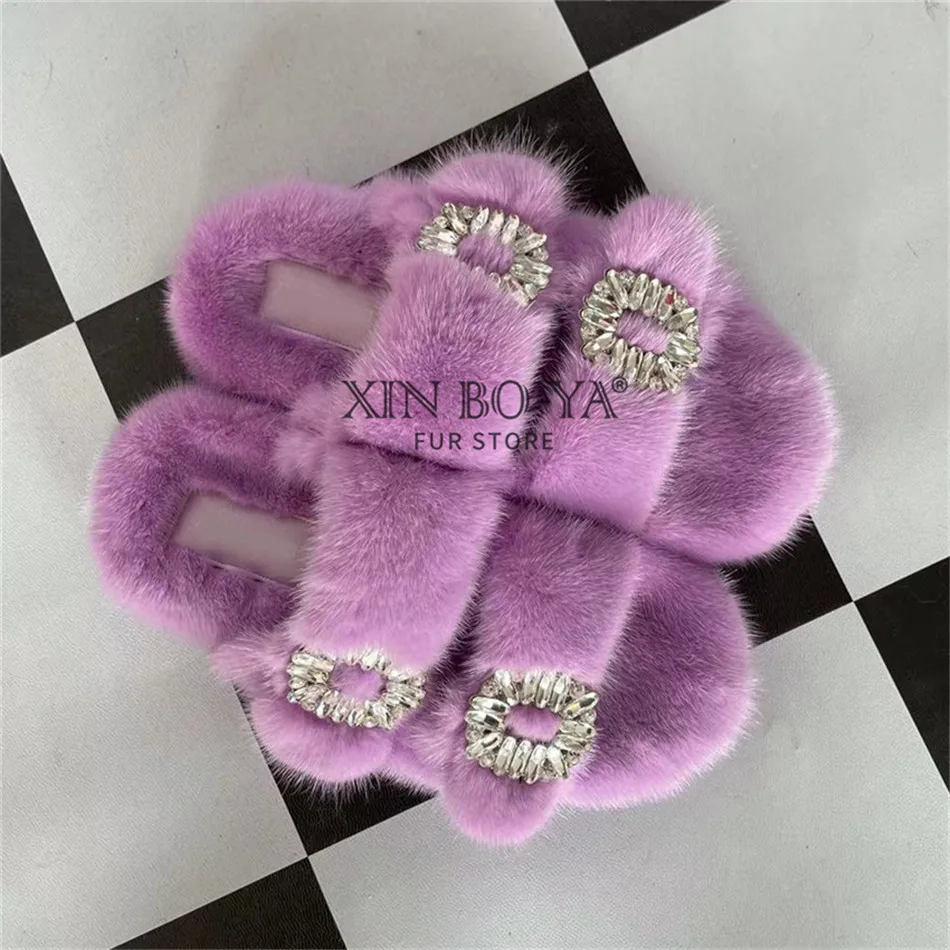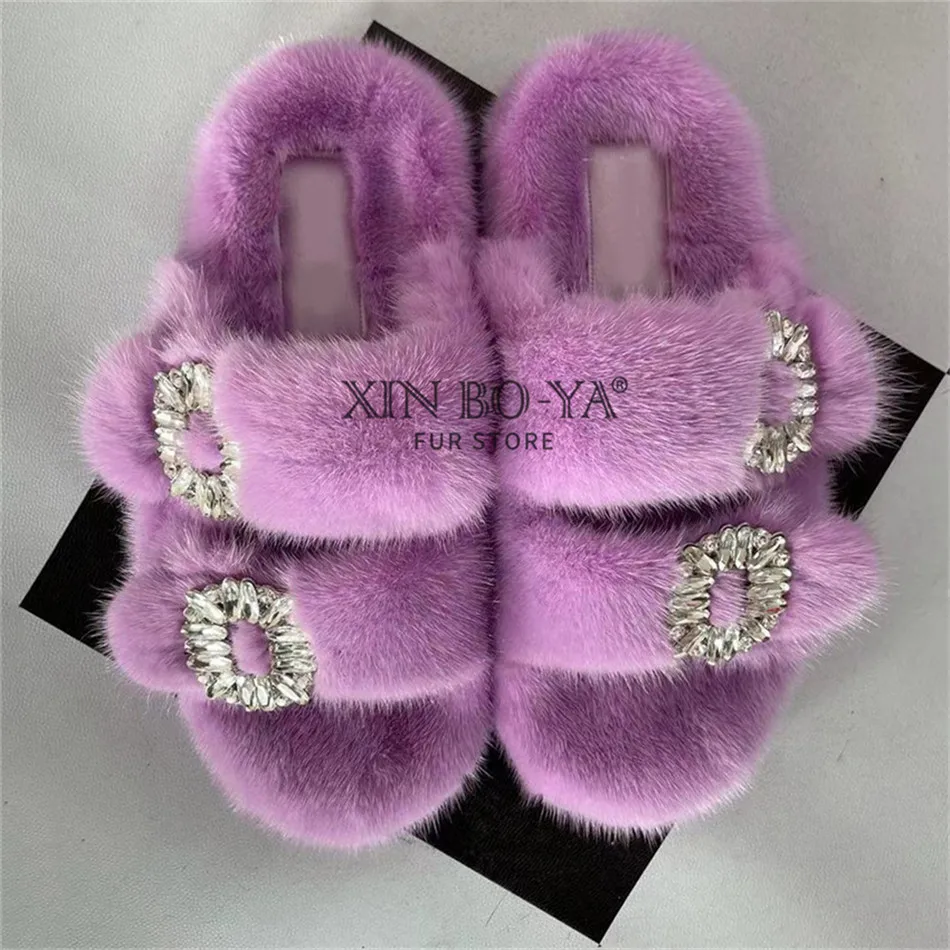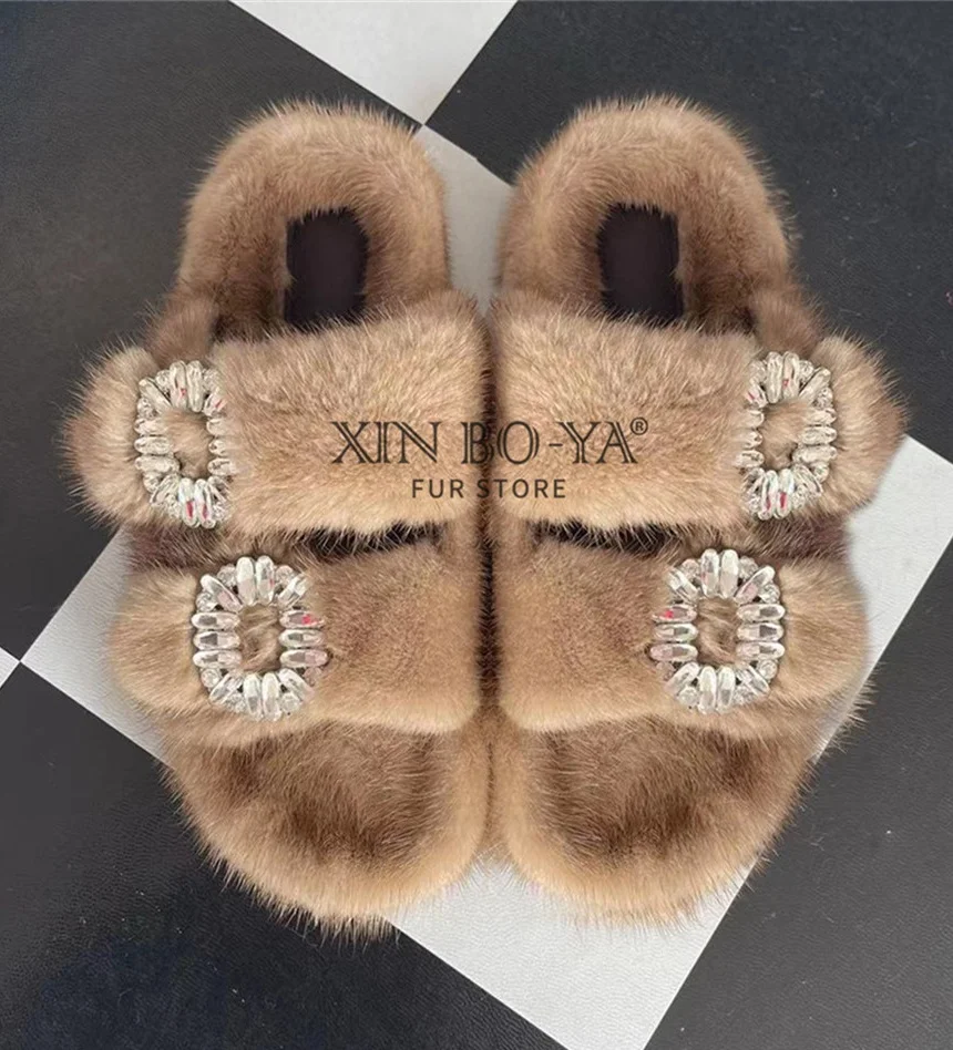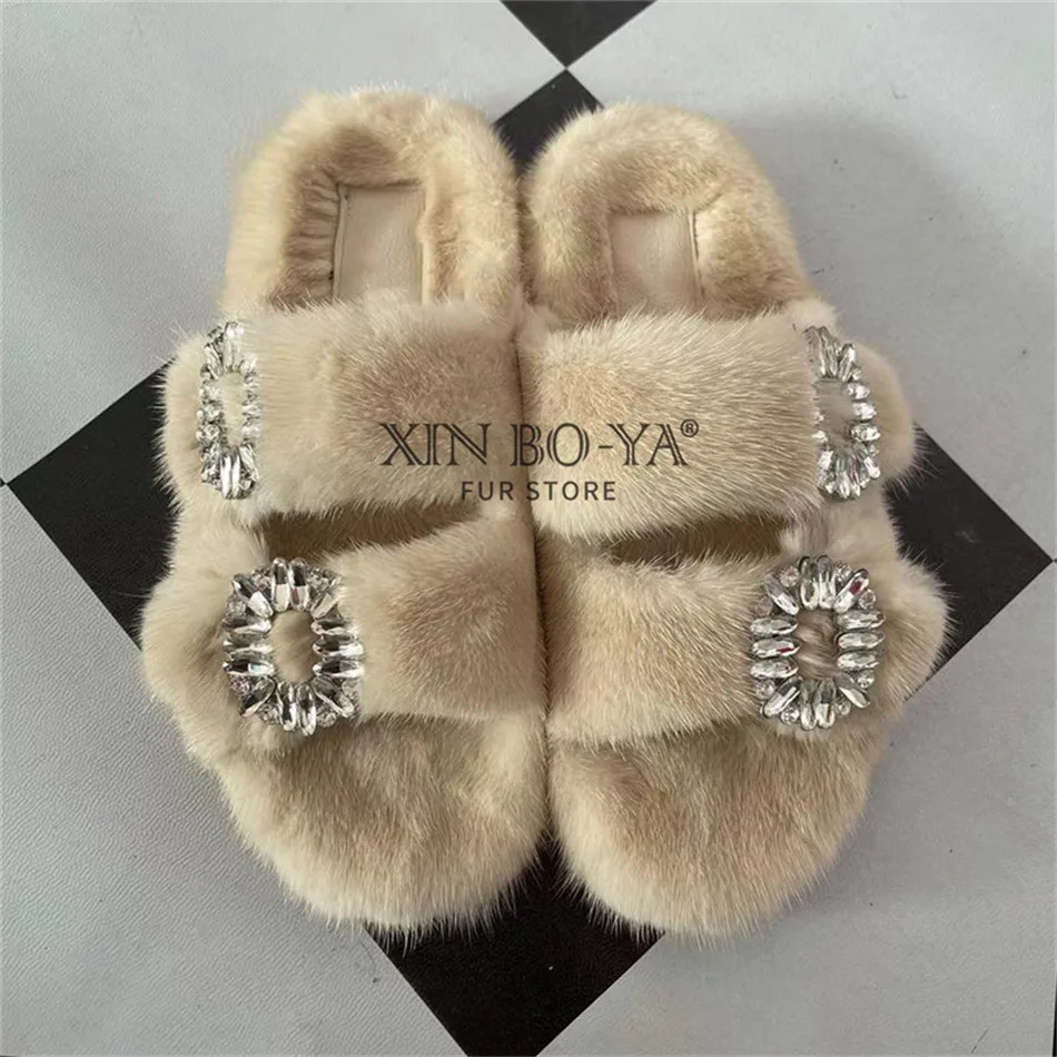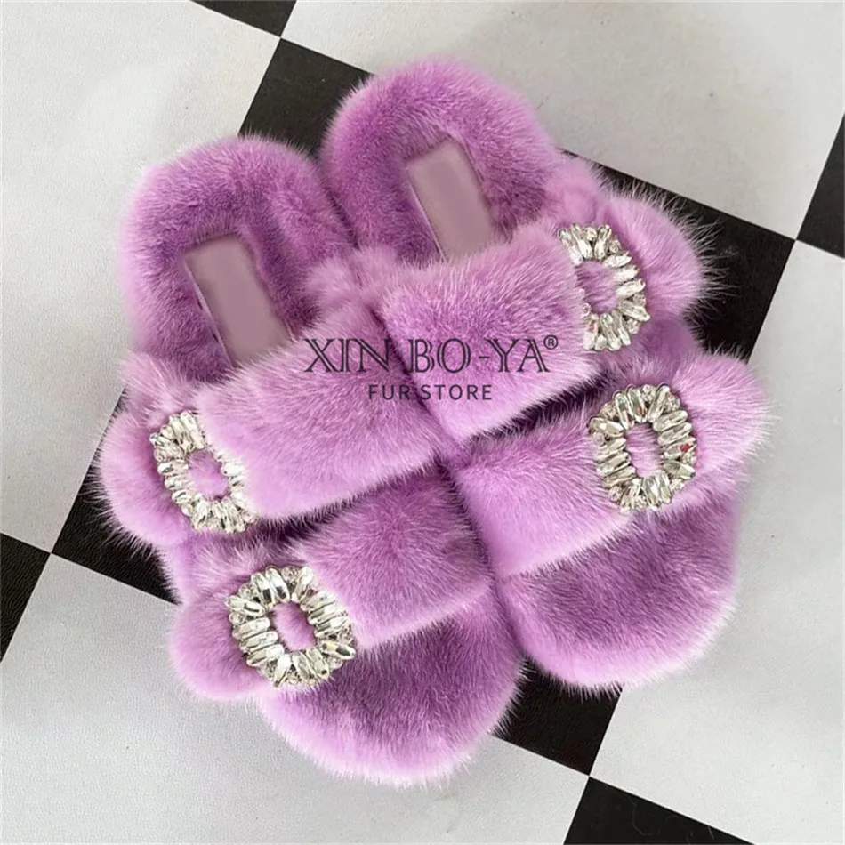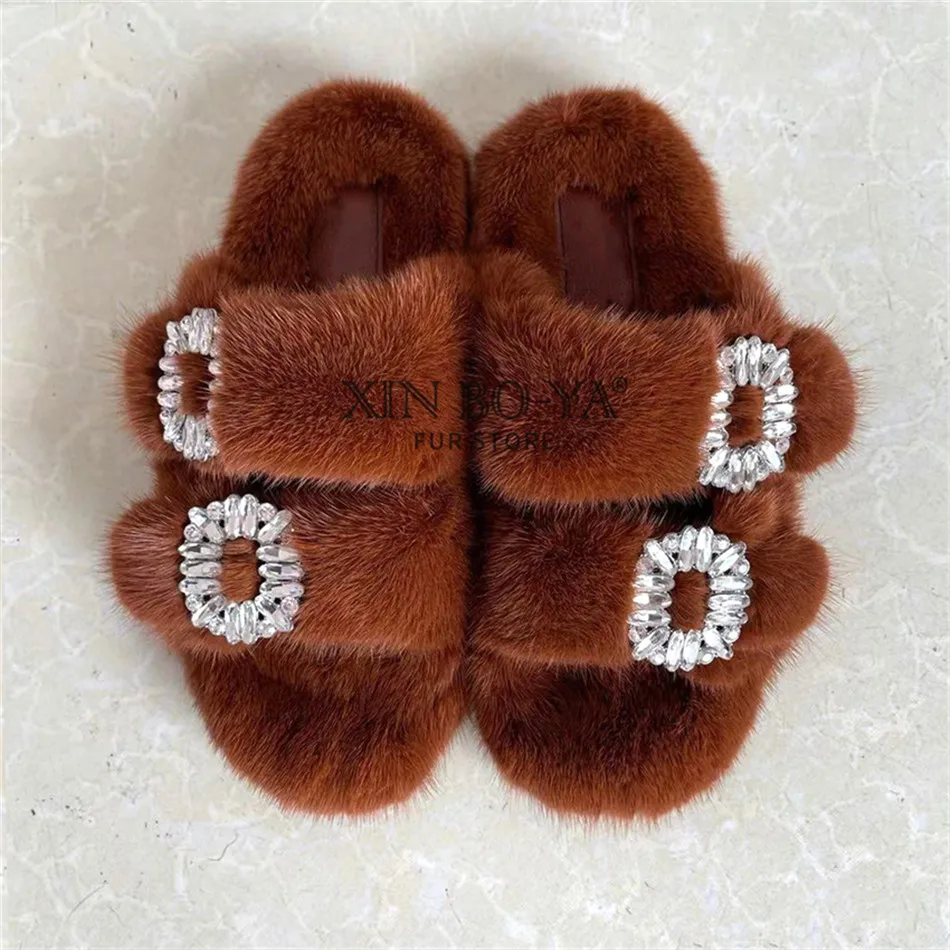Luxus Nerzfell Hausschuhe Damen 100% | Flauschige Sandalen Flach Premium