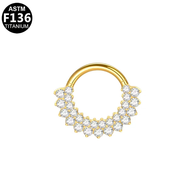 Dieser funkelnde Clicker-Ring bringt royalen Glanz an deine Nase oder dein Ohr. Der „Royal Bloom“ besteht aus medizinischem ASTM F136 Titan und ist mit zwei dicht gesetzten Reihen klarer 5A Zirkonia besetzt – ein absoluter Blickfang für Septum oder Daith. Der integrierte Scharnier-Clicker sorgt für sicheren Halt und einfaches Einsetzen, ganz ohne Werkzeug. Erhältlich in edlem Silber oder warmem Gold.