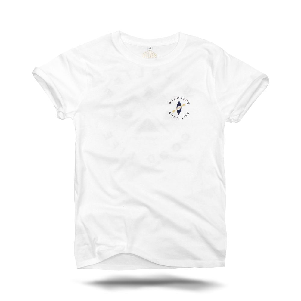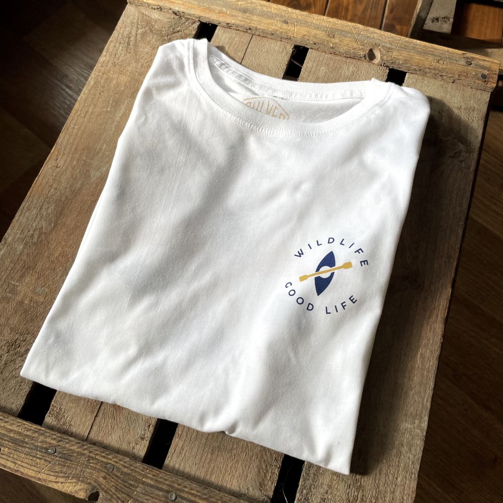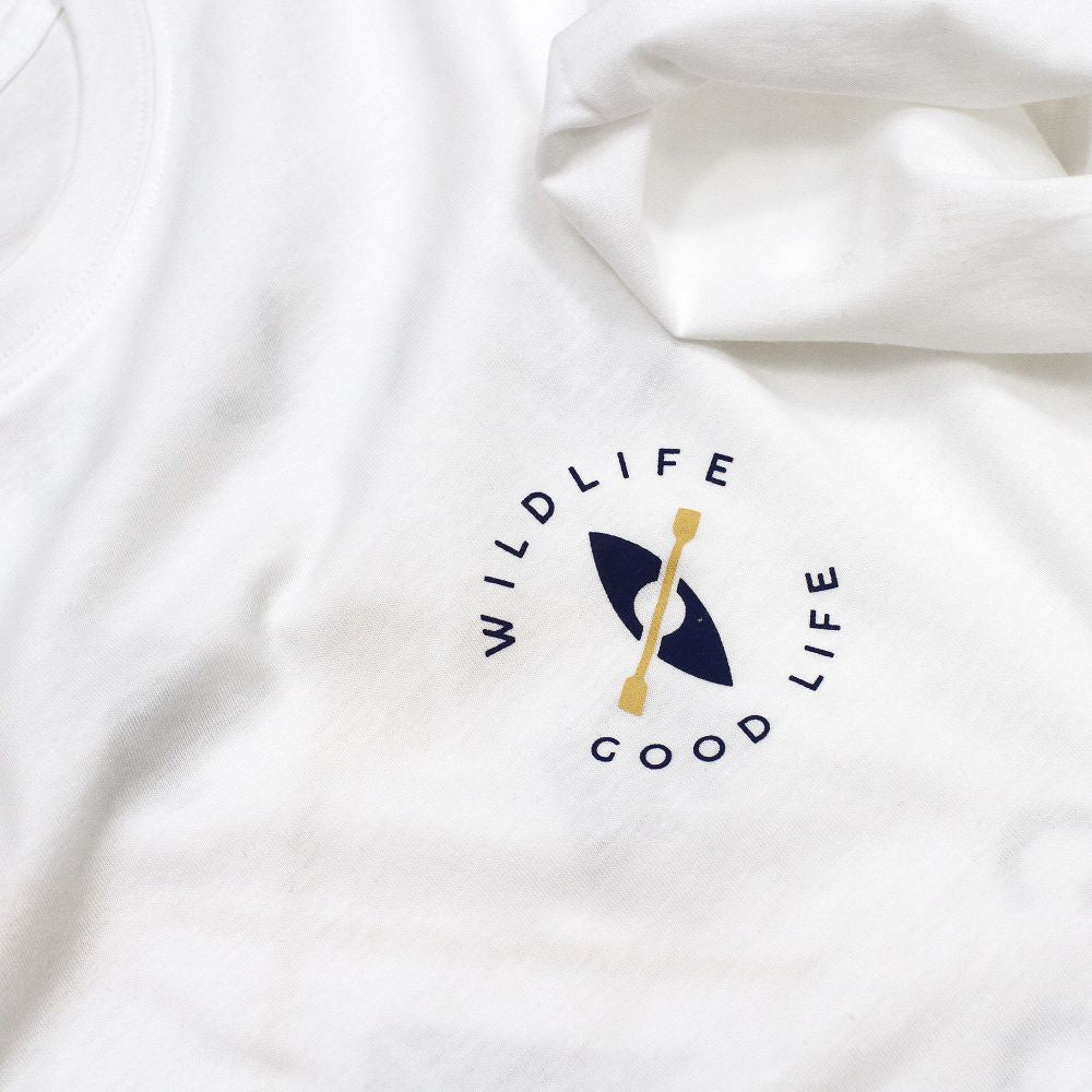 Wildlife Camping T-Shirt mit großem zweifarbigem Rückendruck und kleinem Brustdruck. Einzeln handgedruckt auf Biobaumwolle.