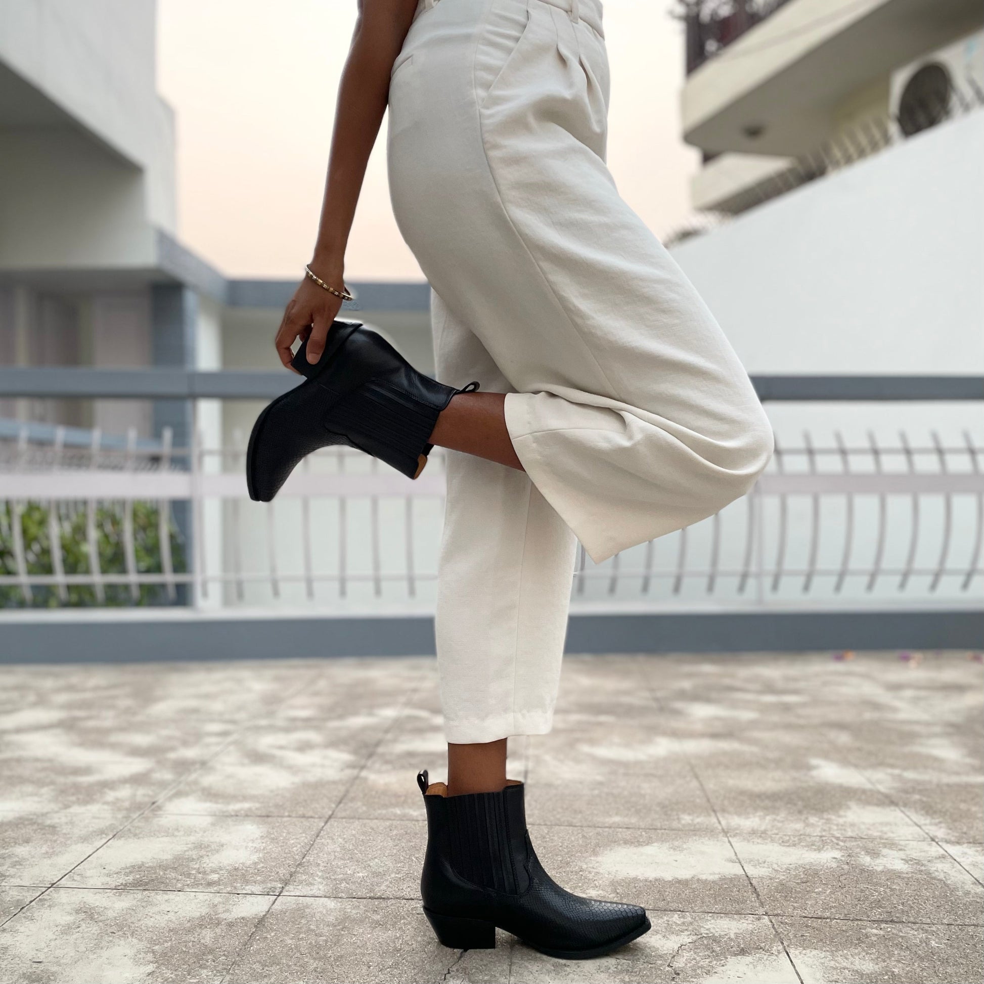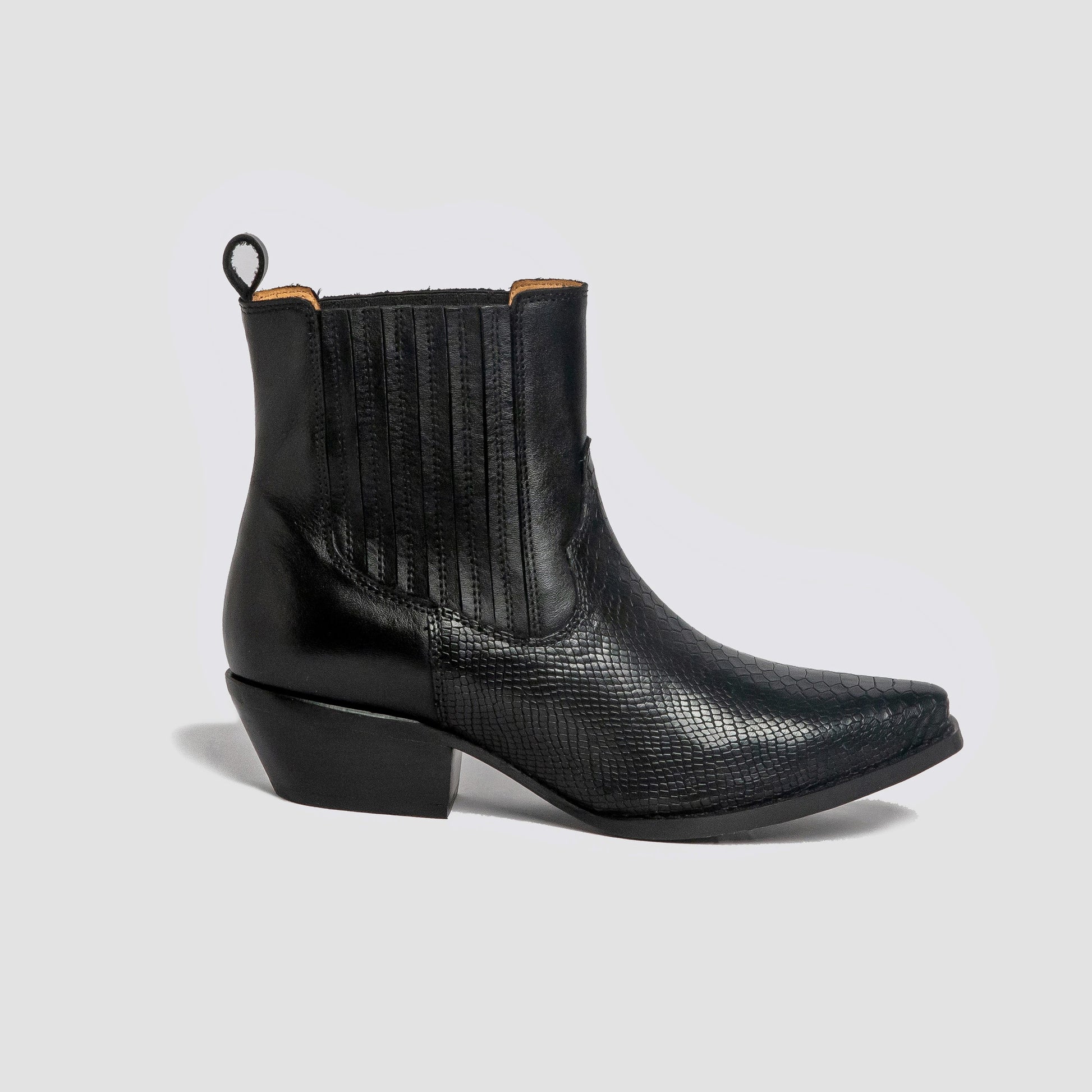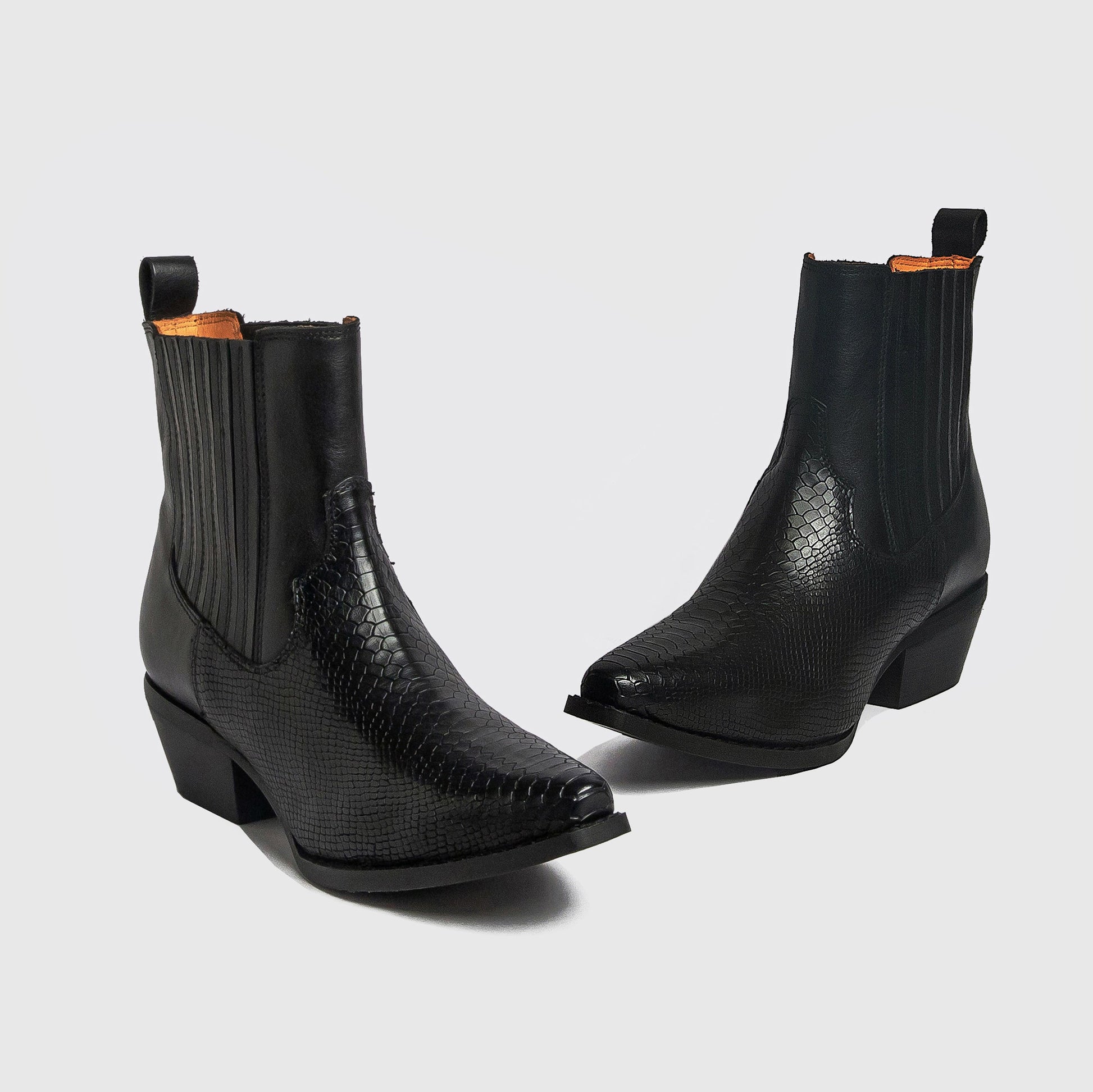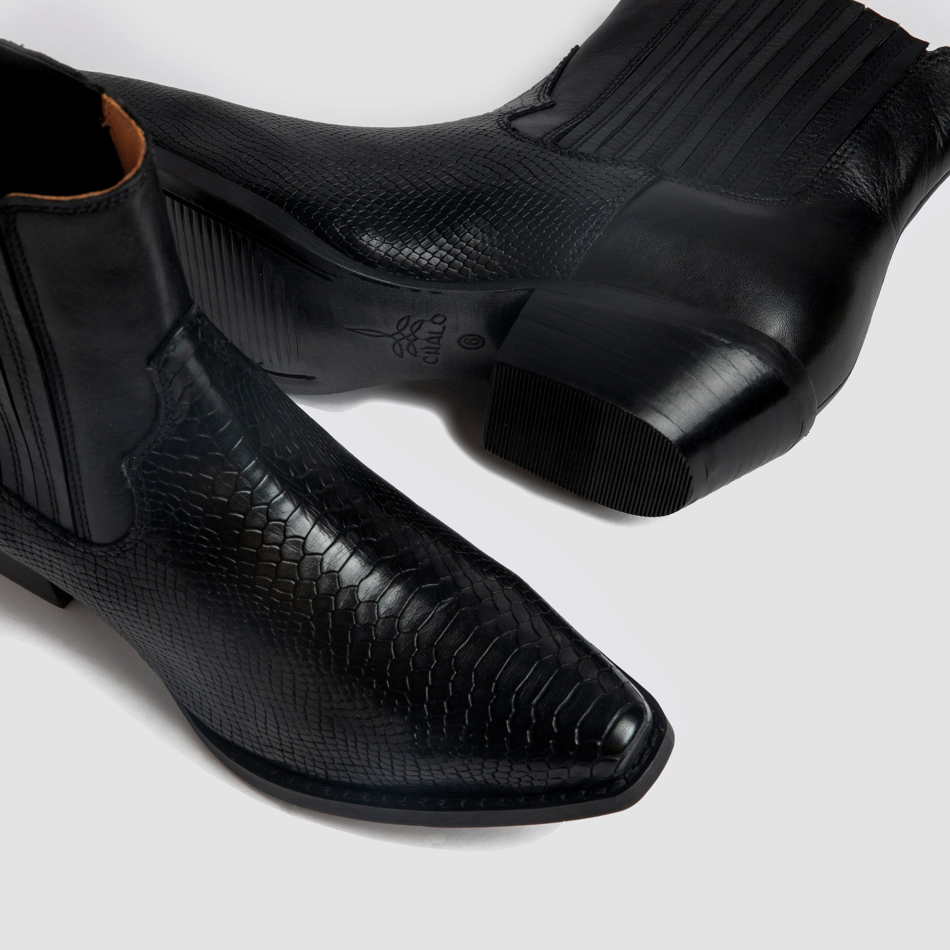 A sleek Chelsea boot with a lizard-printed toe and smooth upper. Like the lizard in its printed toe, this Chelsea boot keeps you close to the ground beneath your feet.